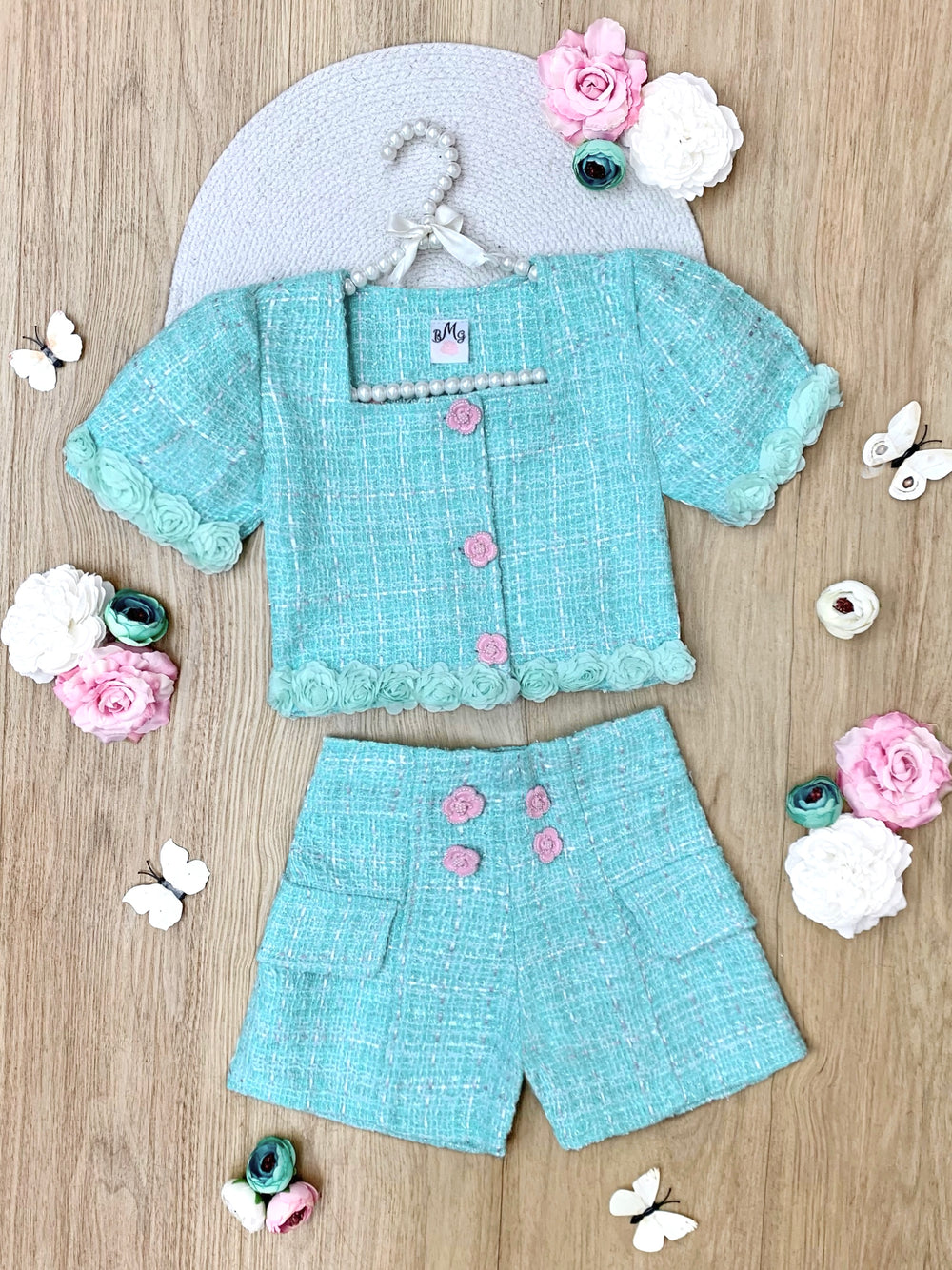 Mint Rosette Puff Sleeve Tweed Top and Short Set