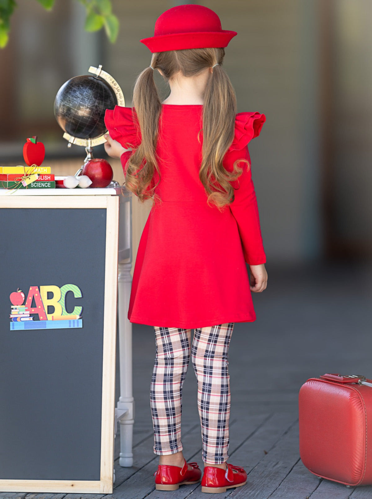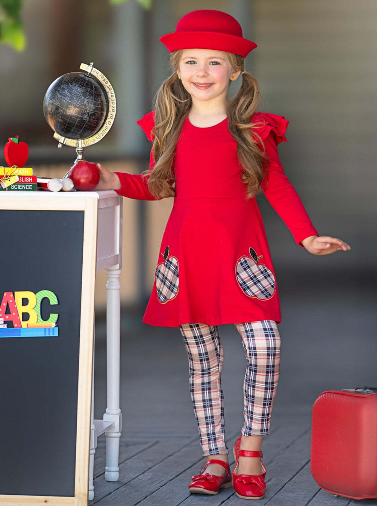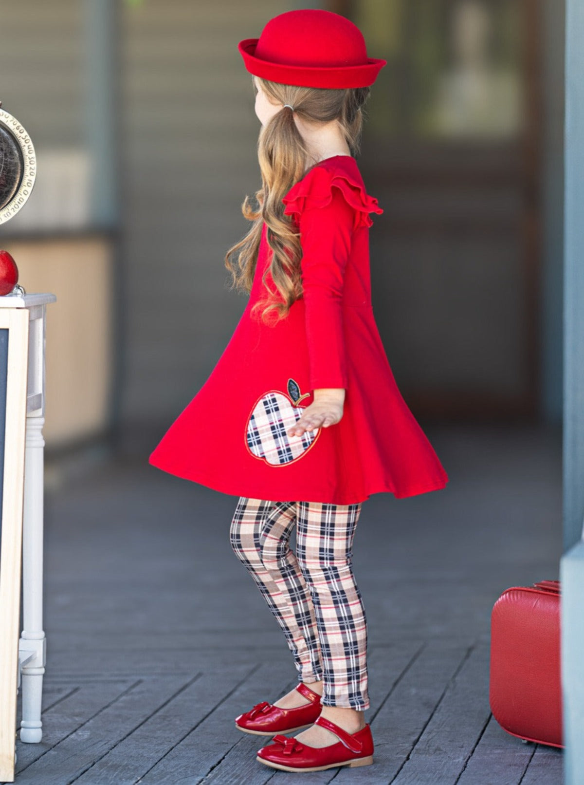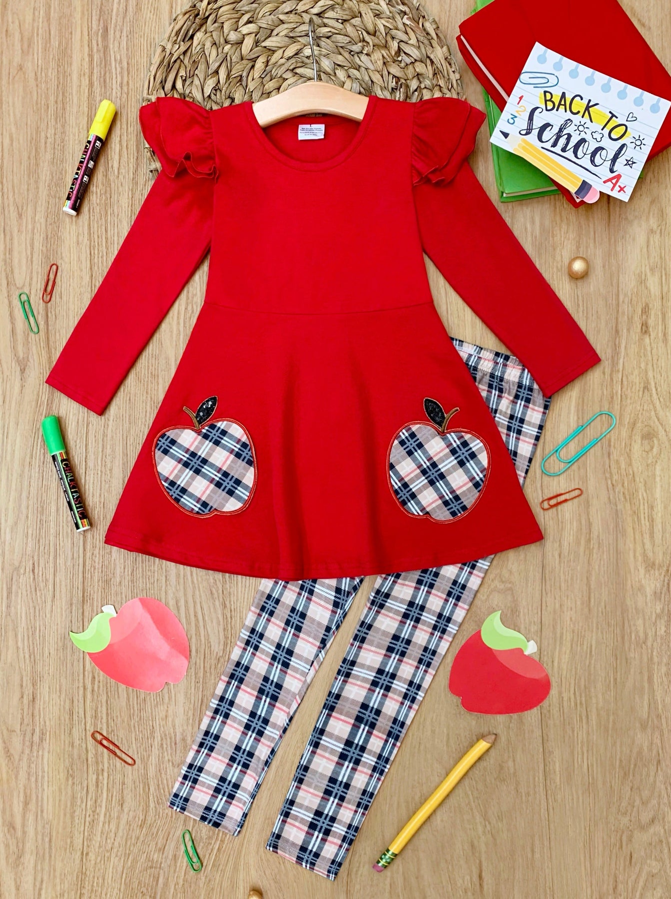 • Set includes red long-sleeve ruffle tunic with apple pocket design and plaid leggings