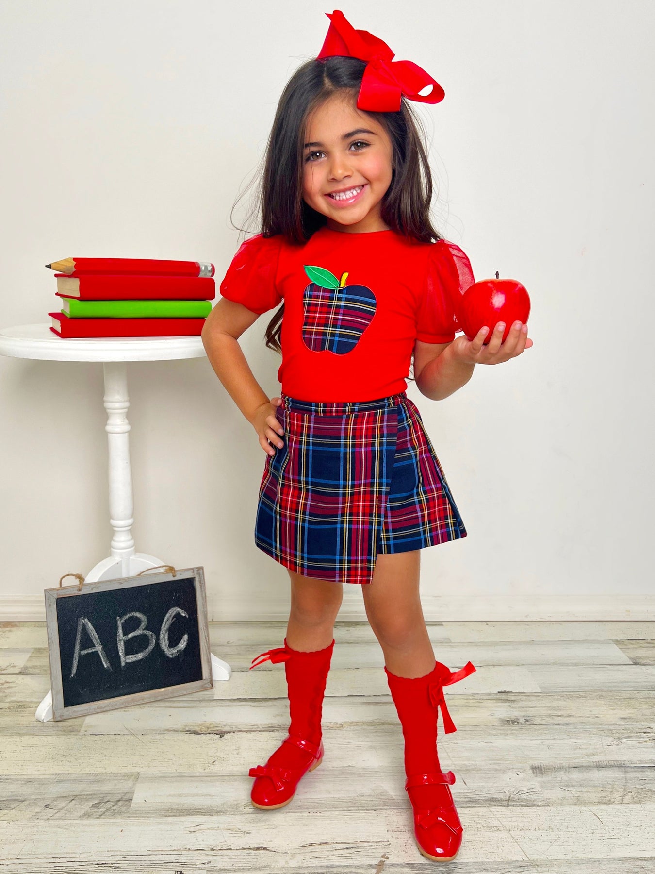 - Puff sleeve top with an embroidered plaid apple and matching plaid skort