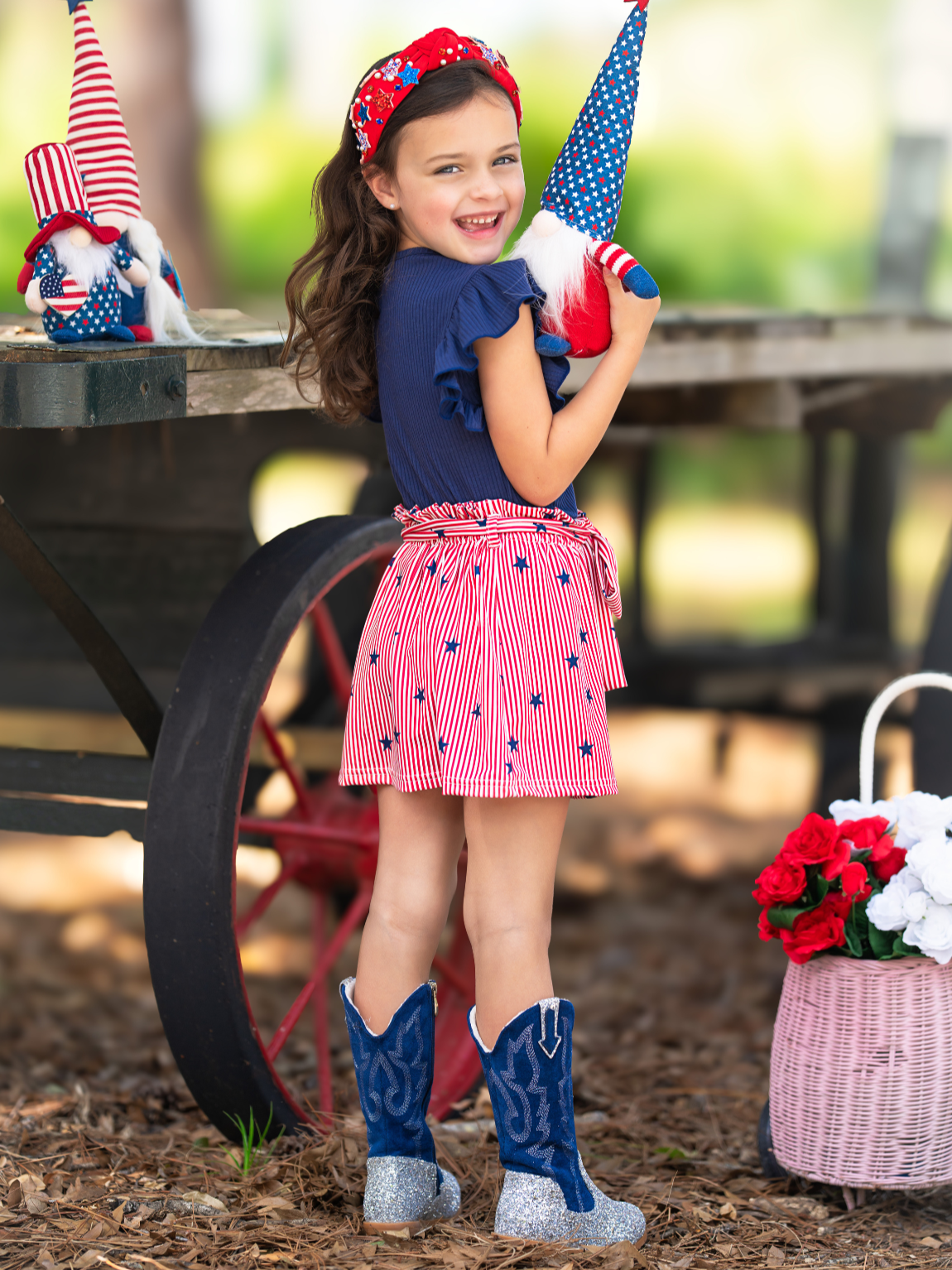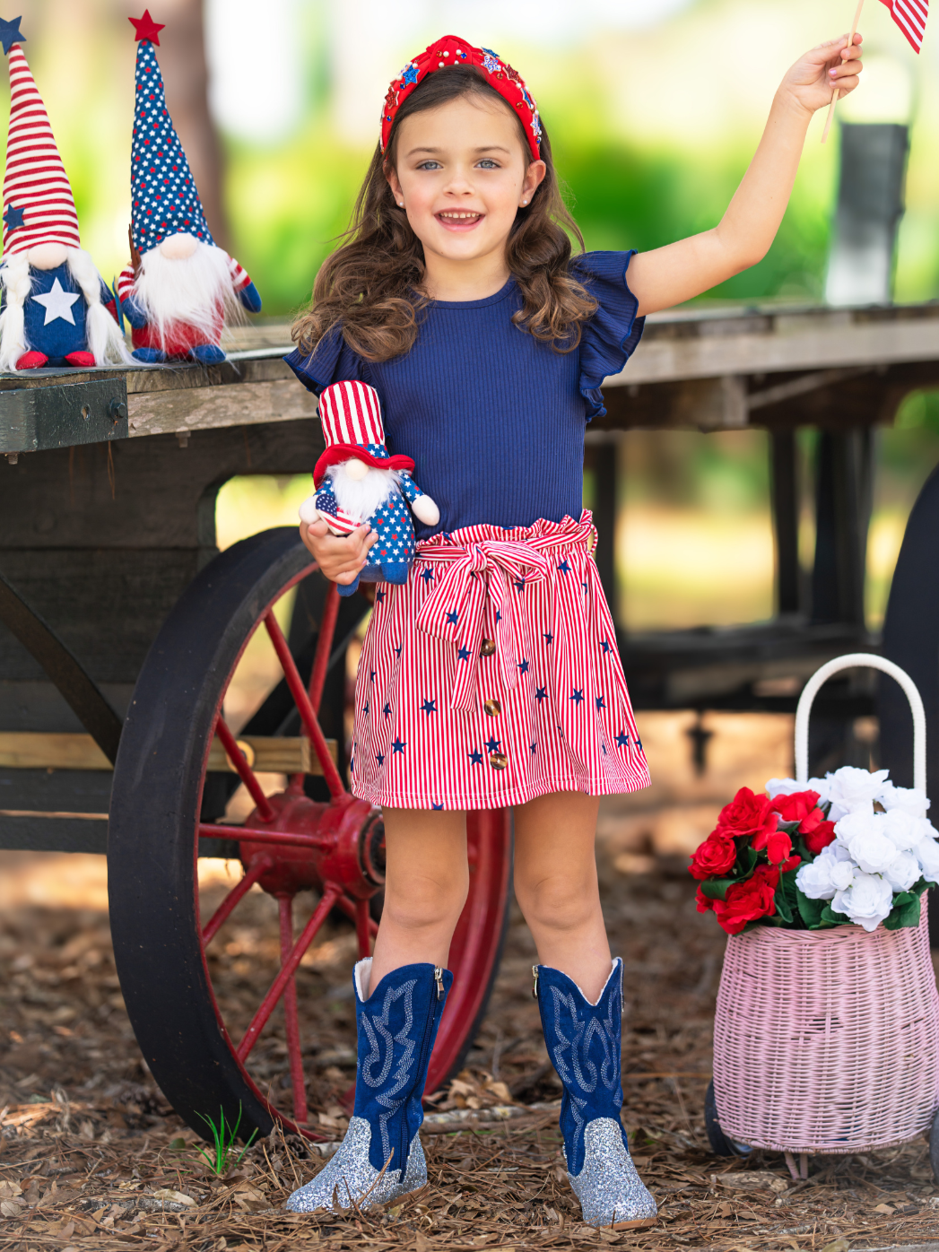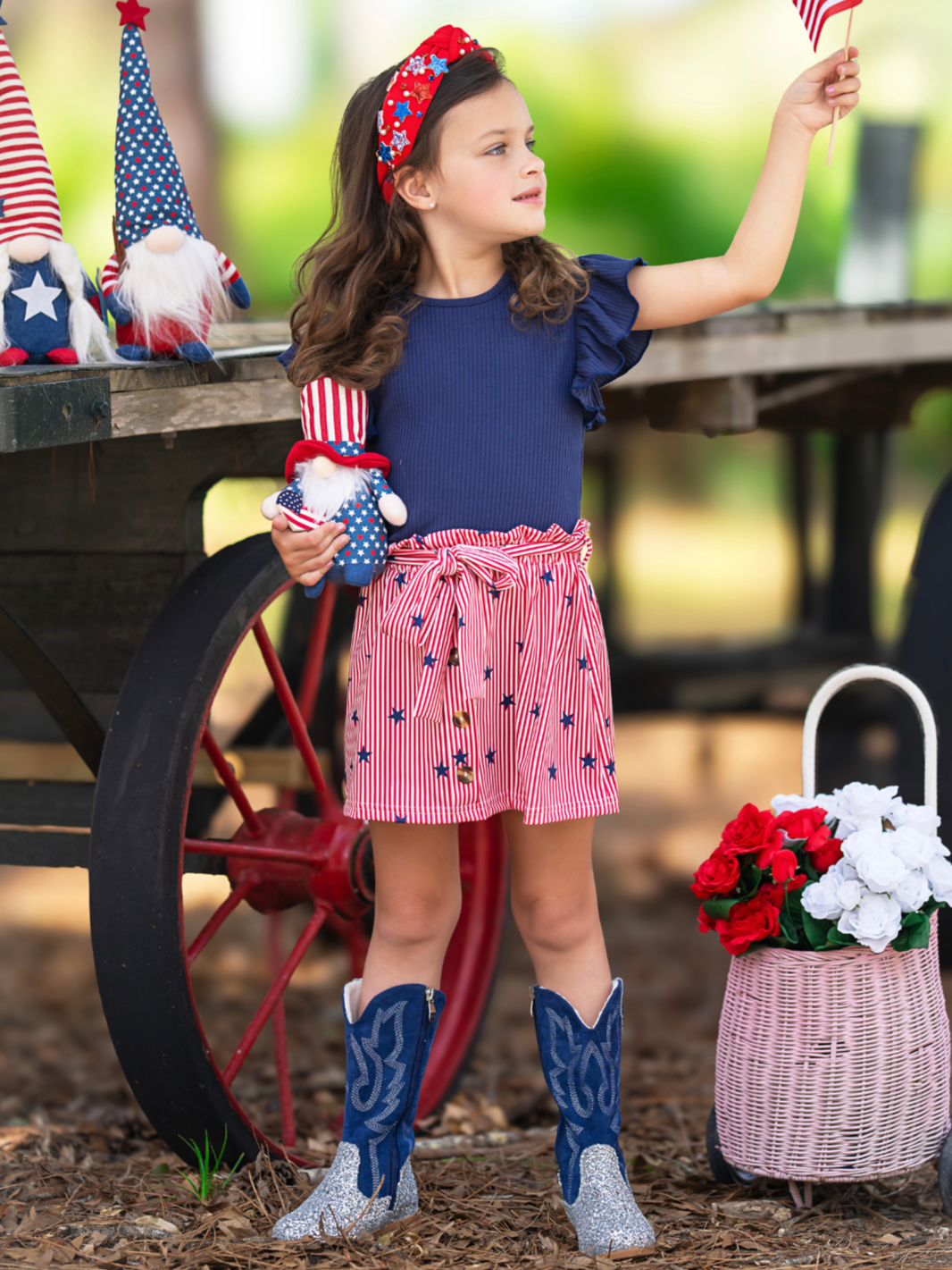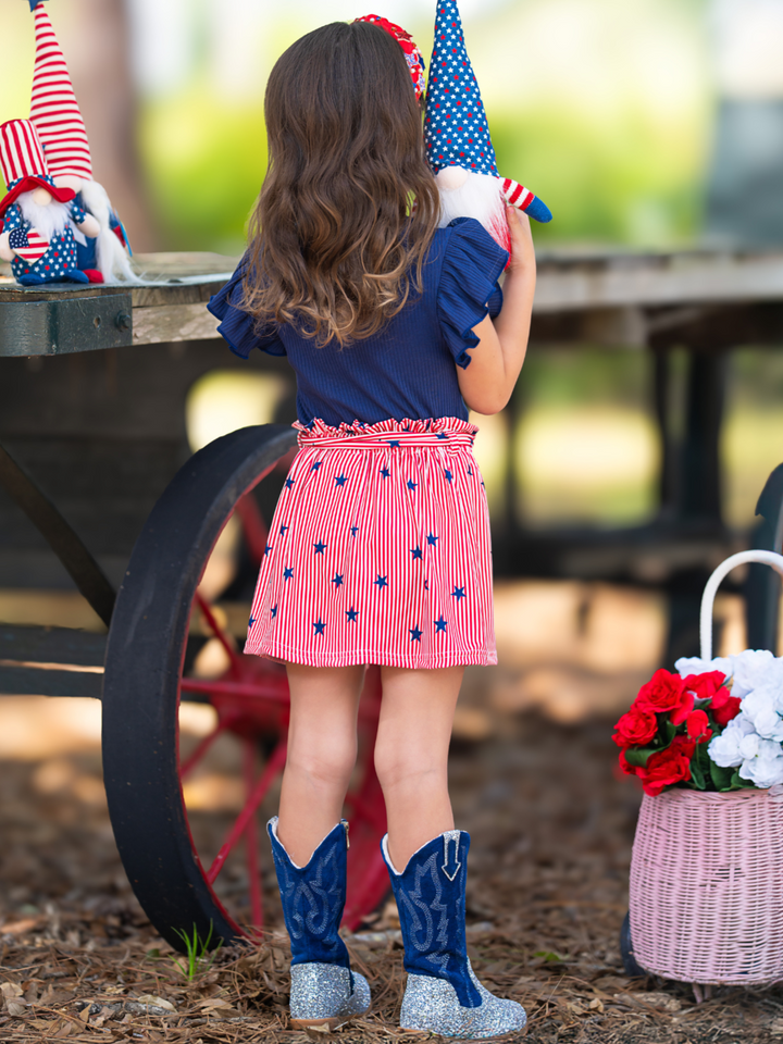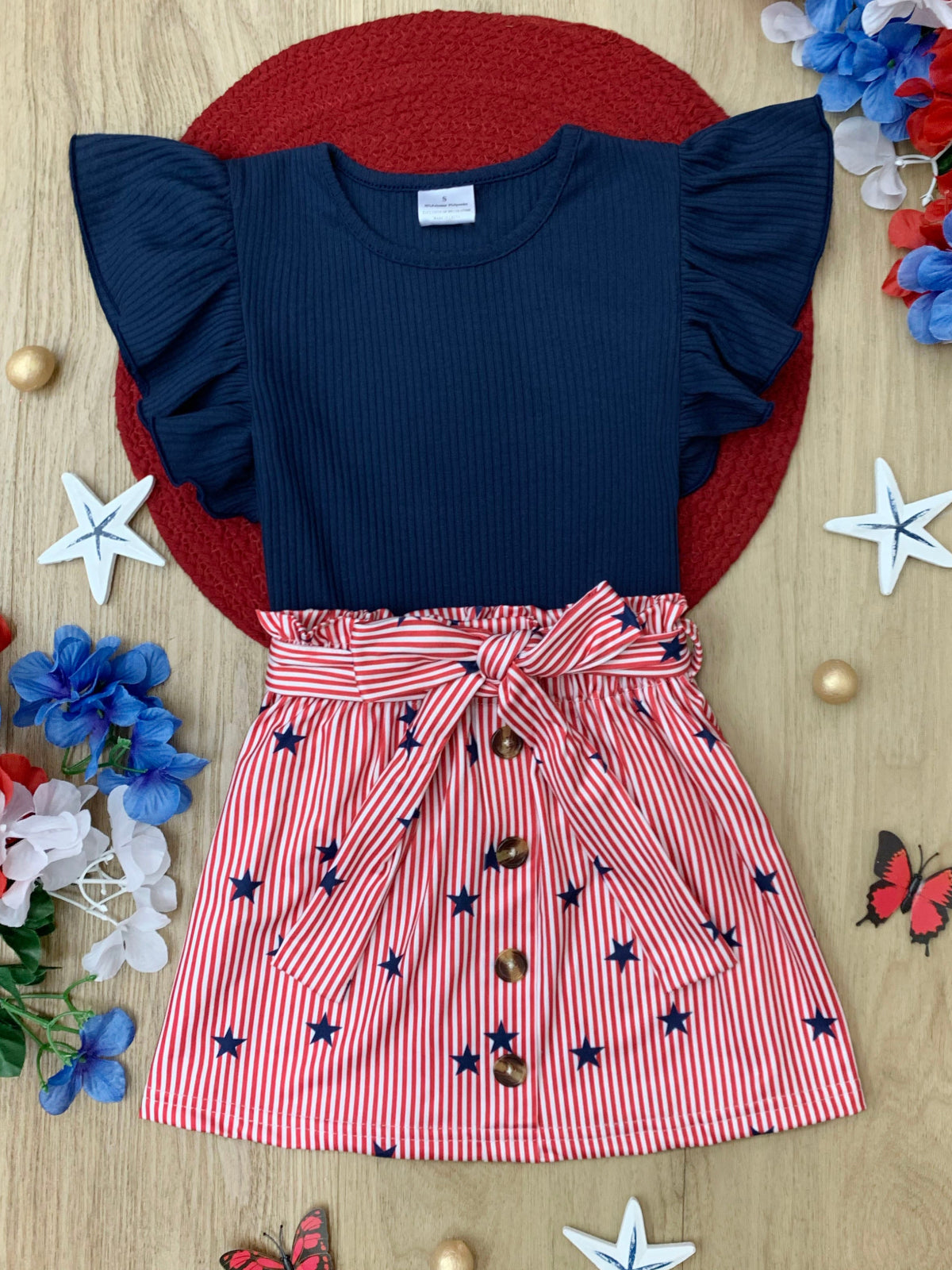 The ribbed navy top with flutter sleeves pairs perfectly with the striped, star-print skirt, featuring button details and a matching waist tie for an extra touch of charm.