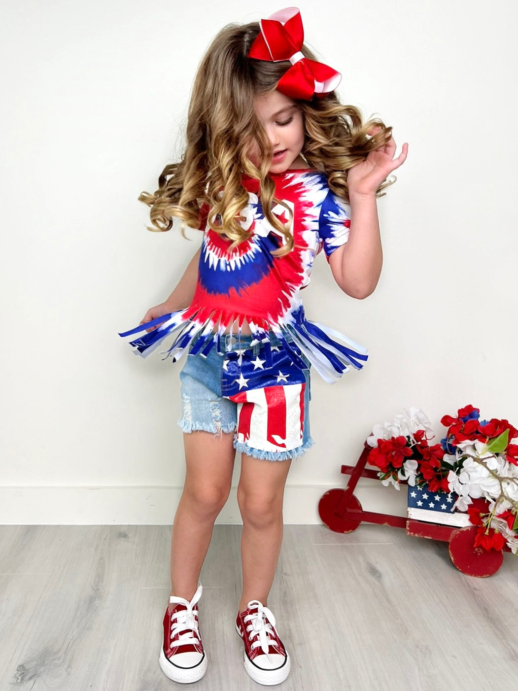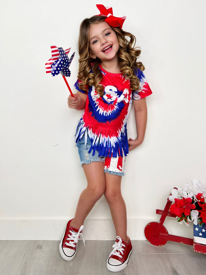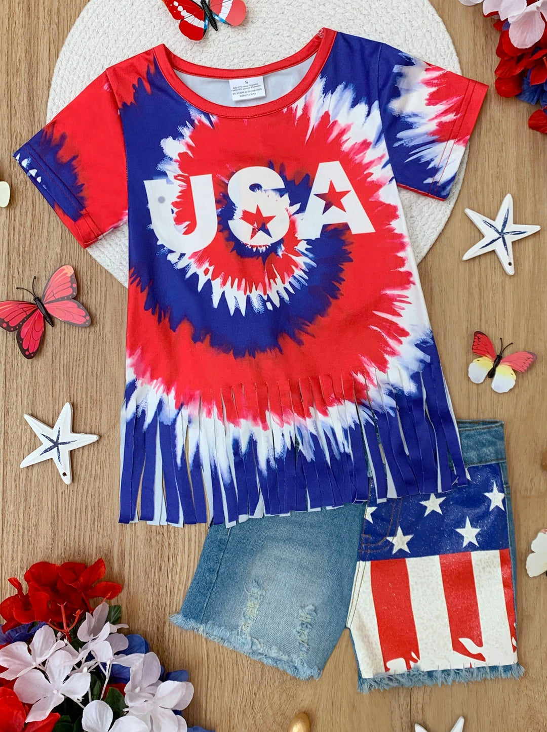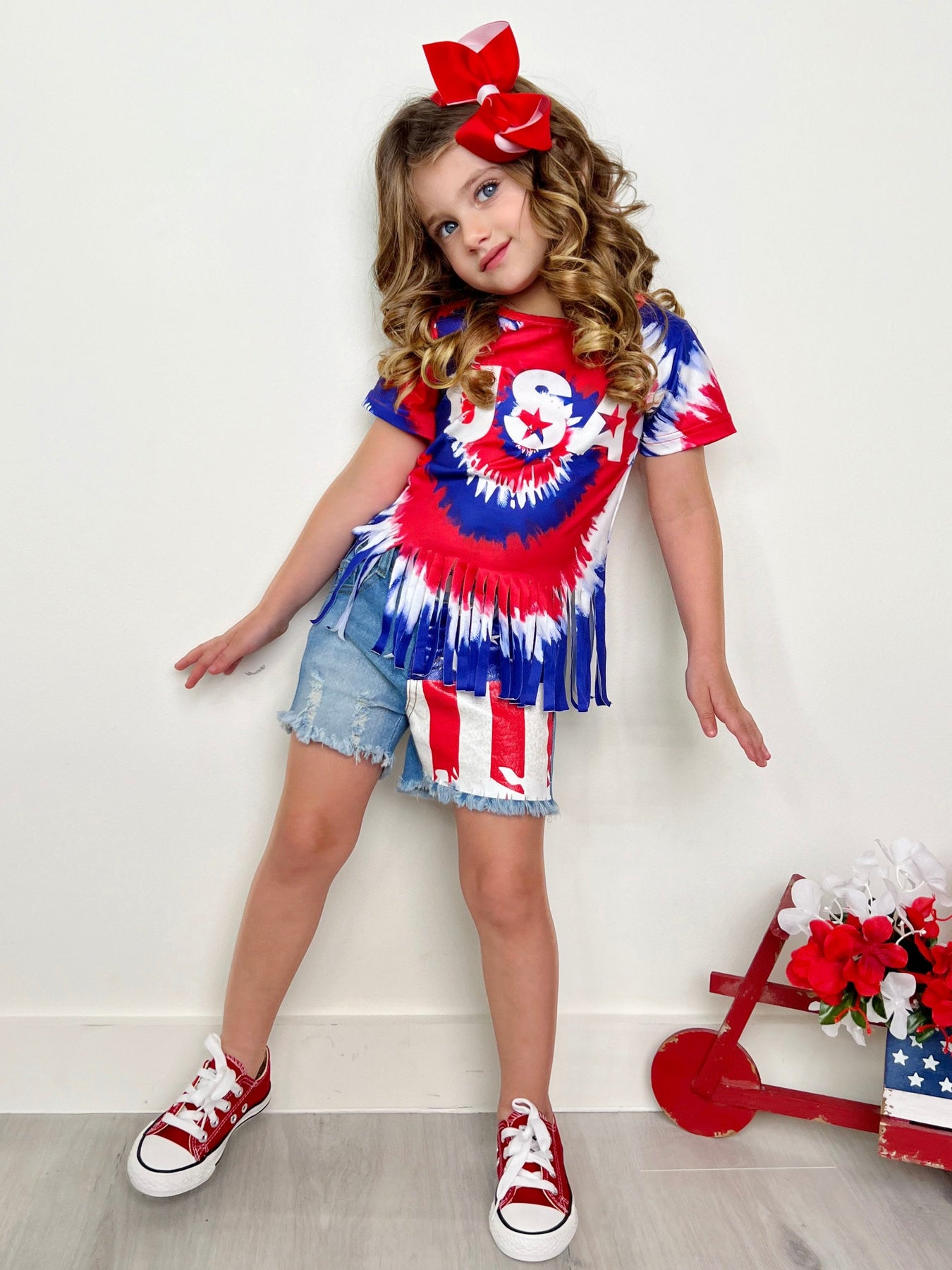 Set includes "USA" graphic tie-dye top with fringe hem and American Flag overlay denim shorts
