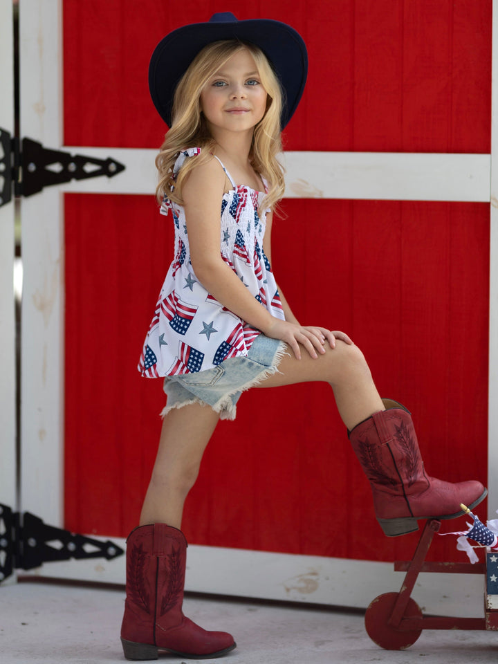 American flag print tie strap smocked top and fringe denim shorts