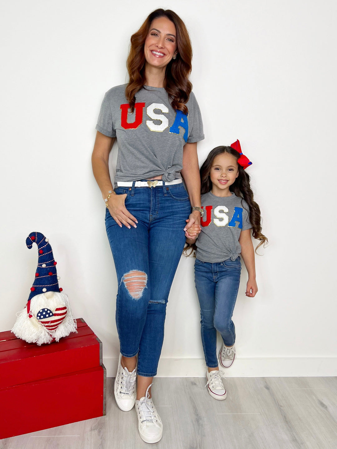 It's going to be a fashionable Fourth of July for you and your fave girl with our Mommy and Me USA top. A classic tee decorated with red, white, and blue USA lettering shows off your patriotic style. Dazzle everyone with your impressive fashion!