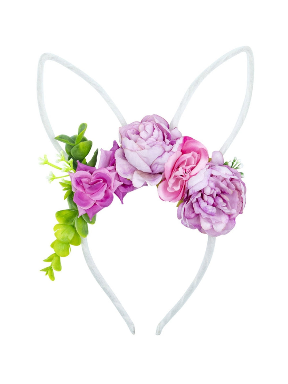 Features delicate artificial flowers in vibrant hues, beautifully arranged on plush bunny ears.