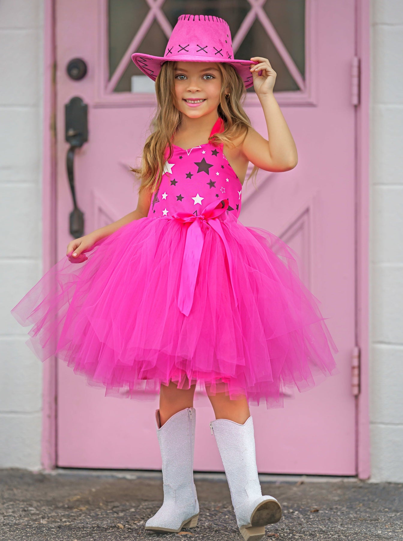 • Tie strap tutu dress with star details and statement bow, pink cowboy hat, and pink bandana