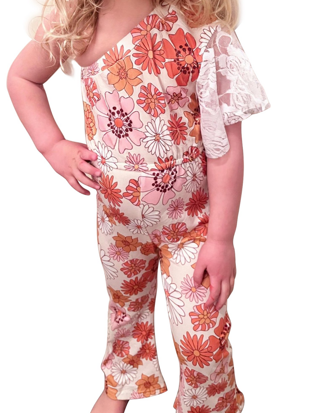 - Bright with blooms, this floral flared jumpsuit will have your little girl looking oh-so-fabulous.