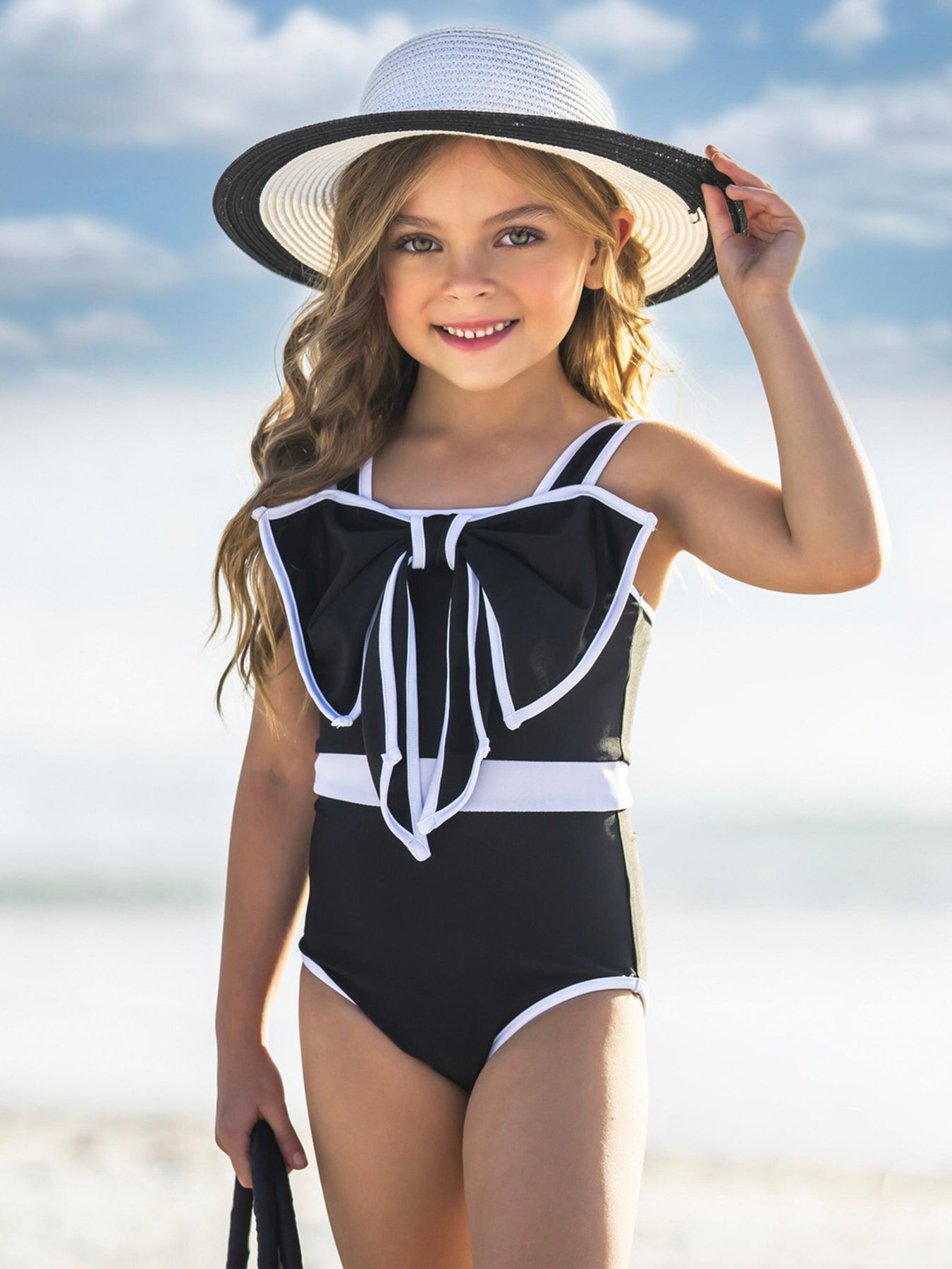 • Let's make her summer a chic moment to remember with a statement bow black one-piece swimsuit that looks oh-so-fashionable. White trim and a striking statement bow make this elegant number sunshine-chic and OOTD-ready. Get ready for fabulous family pics!