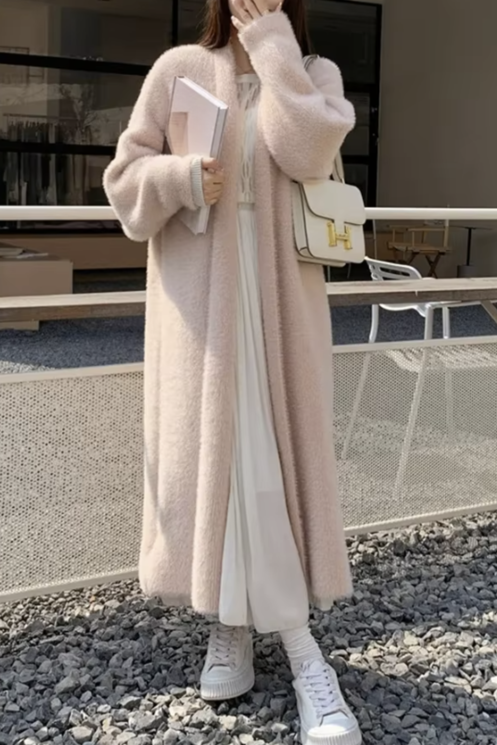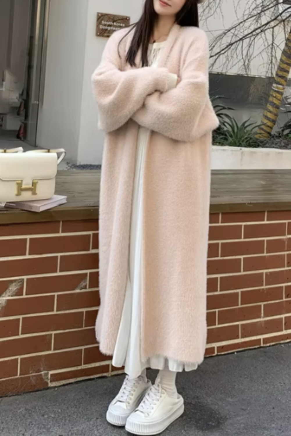 - Embrace effortless style with this knee-length cardigan, crafted from soft imitation mink fleece for ultimate warmth and comfort.