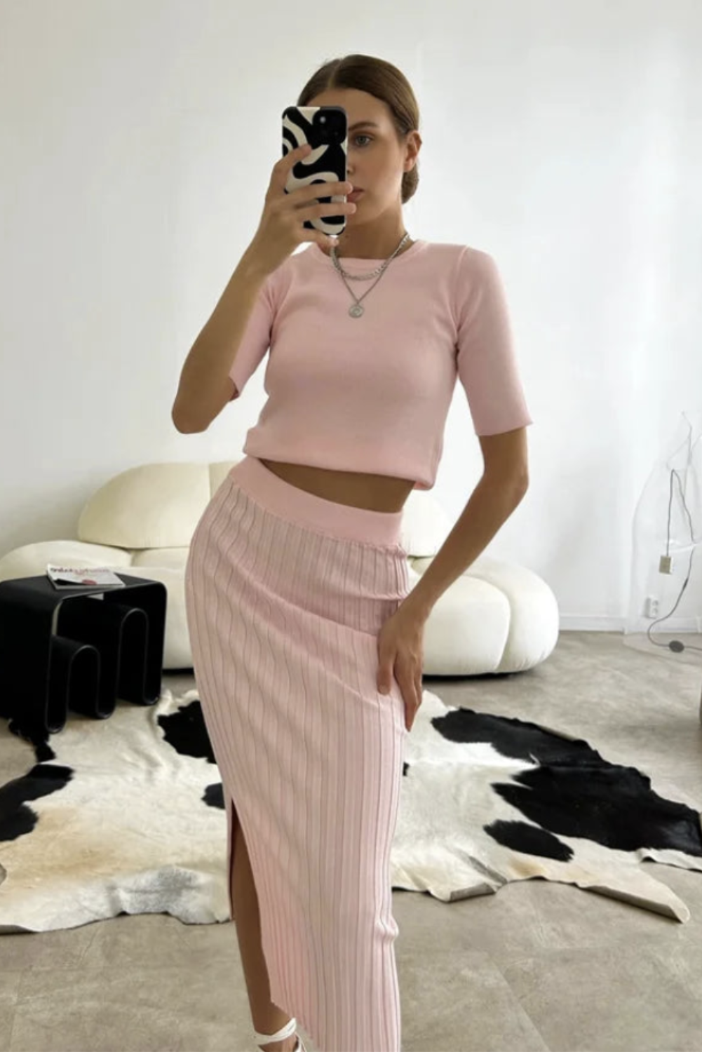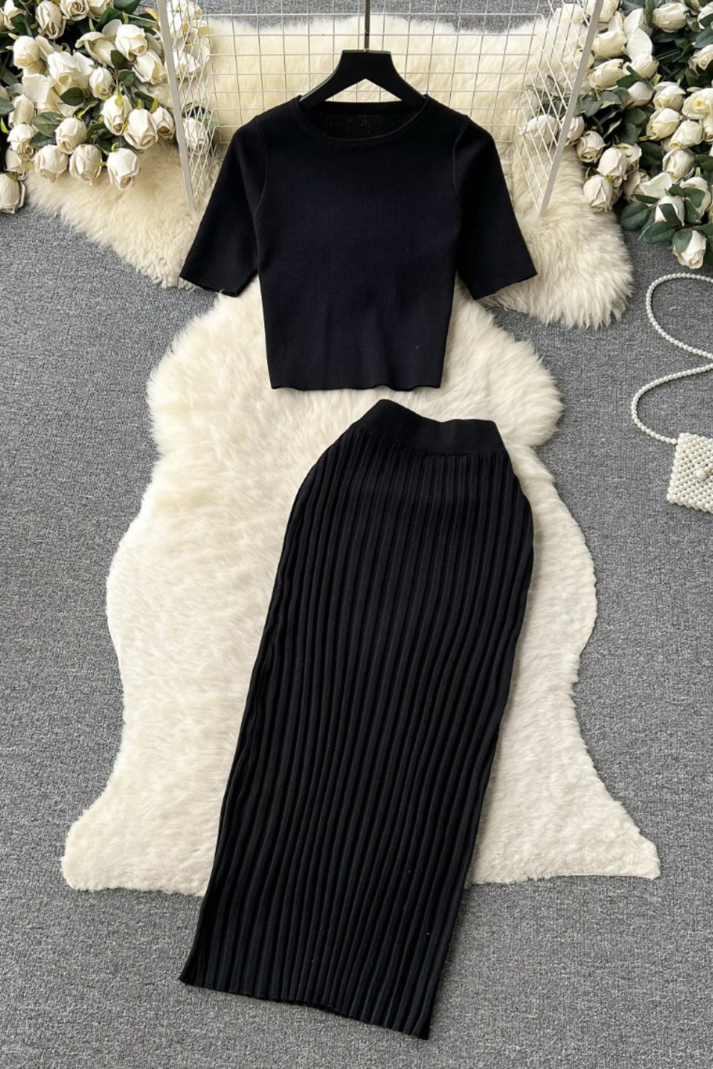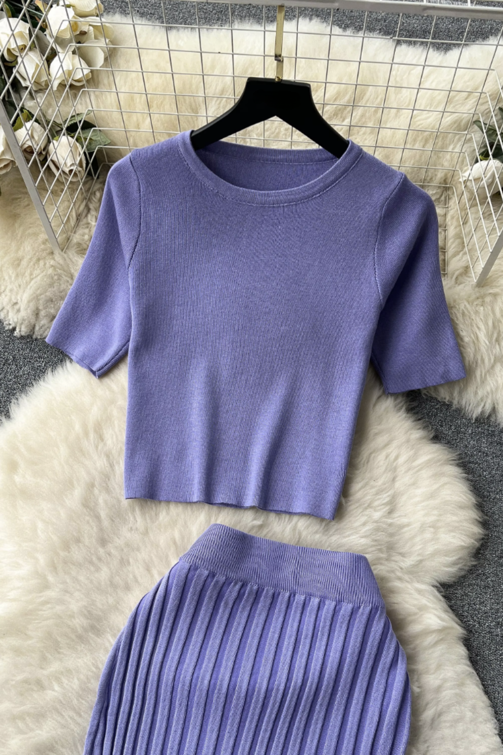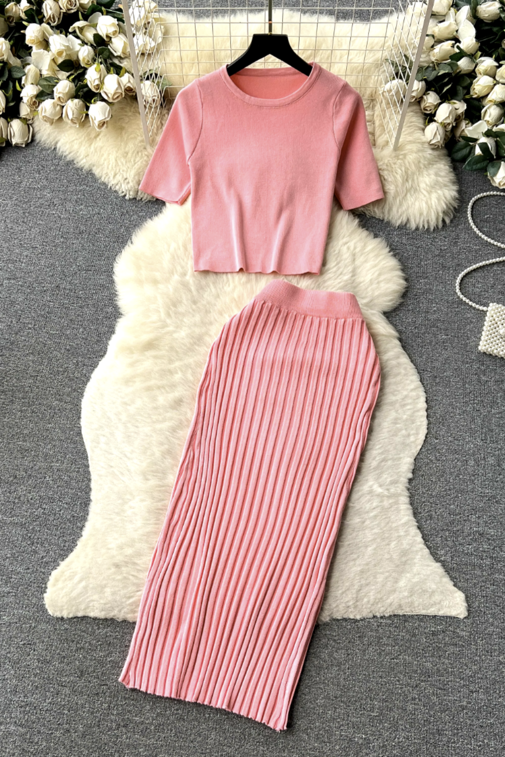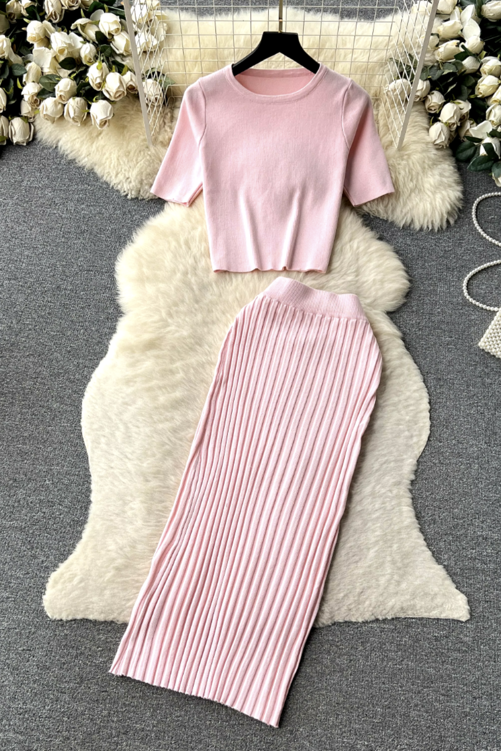 - This cozy knit two-piece set features a relaxed O-neck top paired with a pleated, elastic waist long skirt, perfect for effortless style.