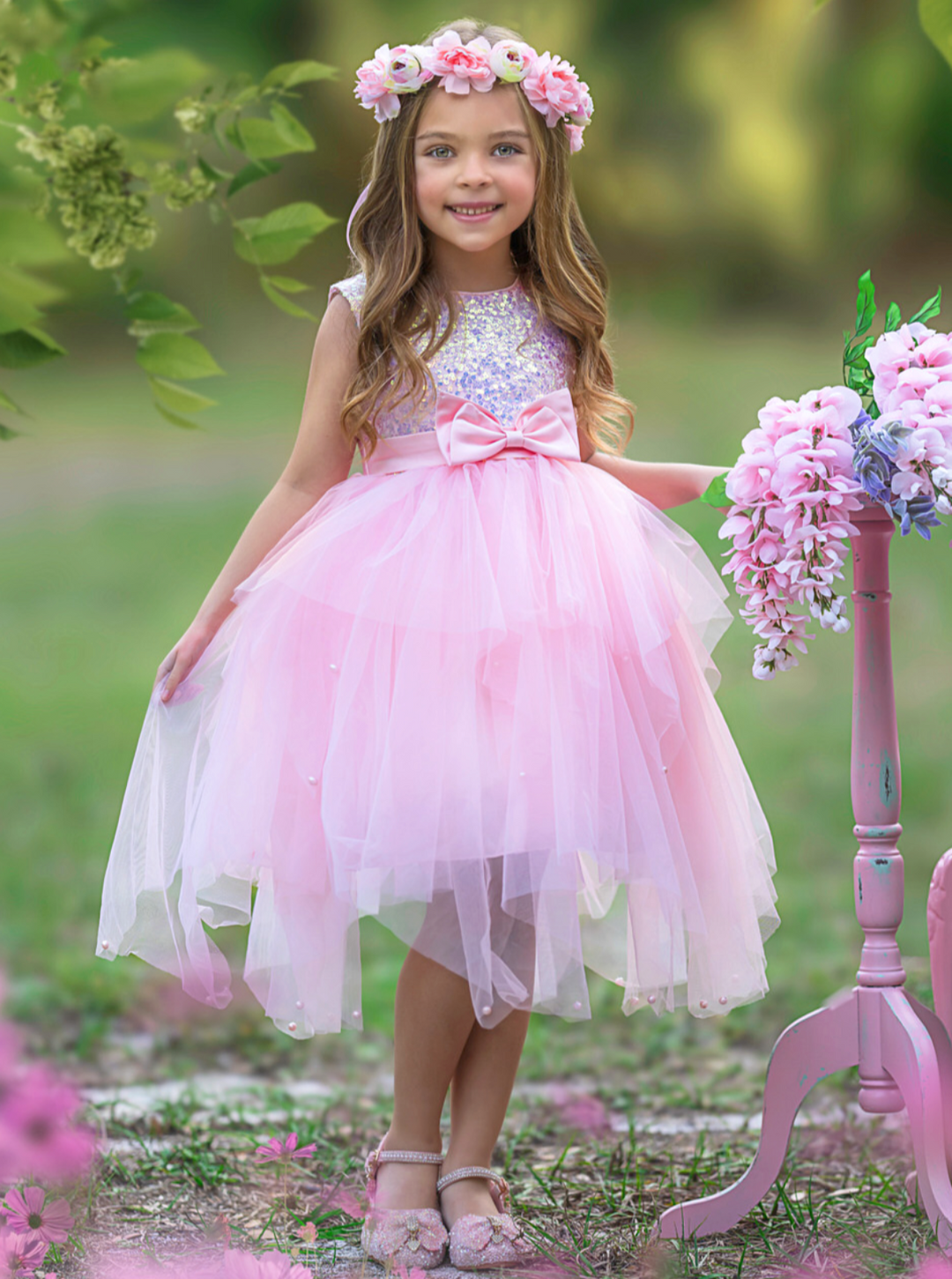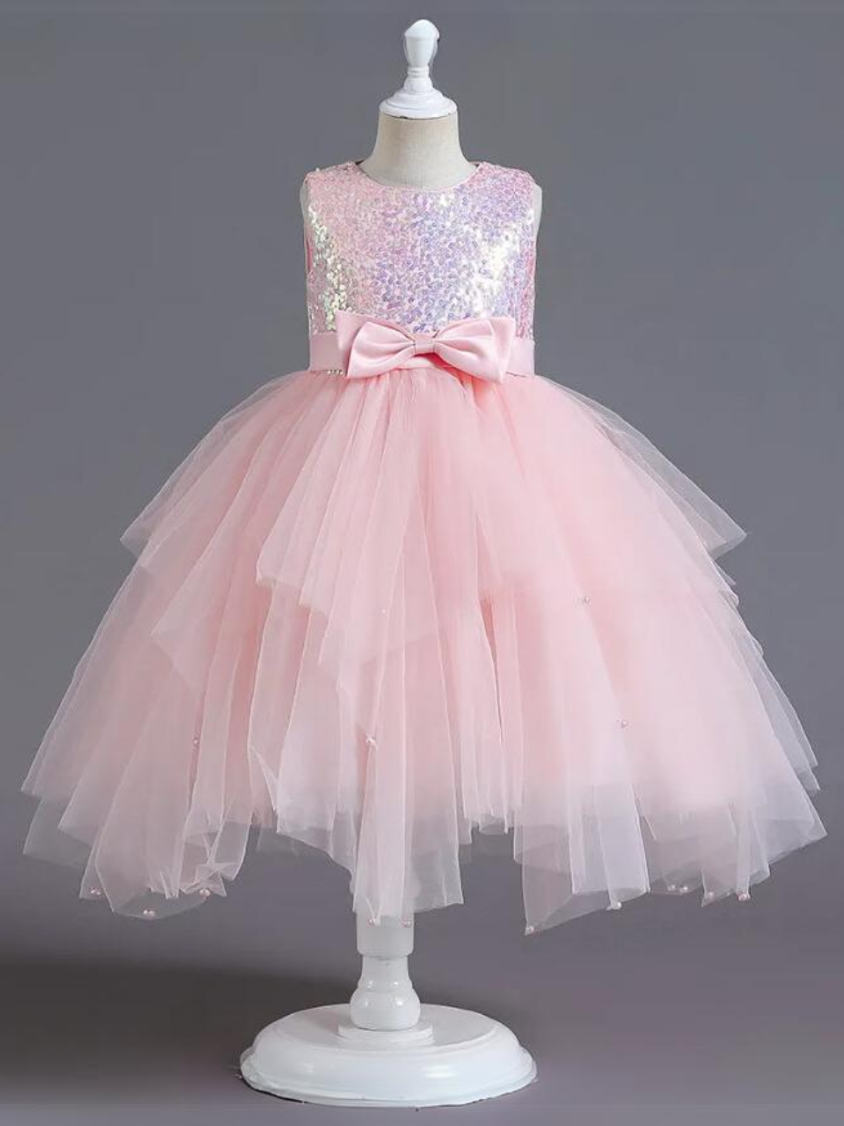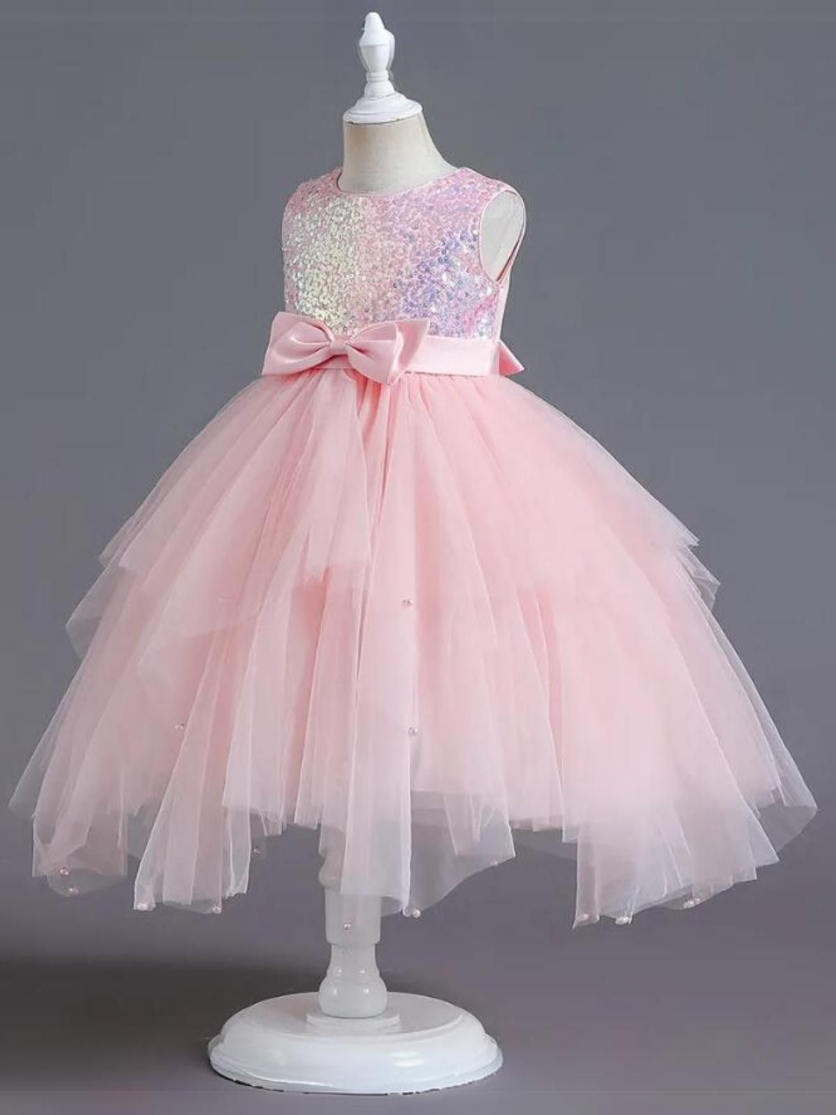 Sleeveless tiered pink tutu tulle dress with pastel sequined bodice and satin bow detail