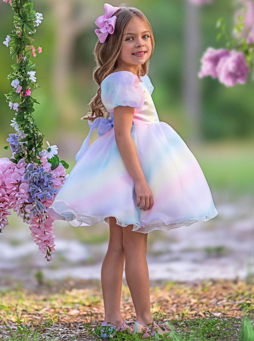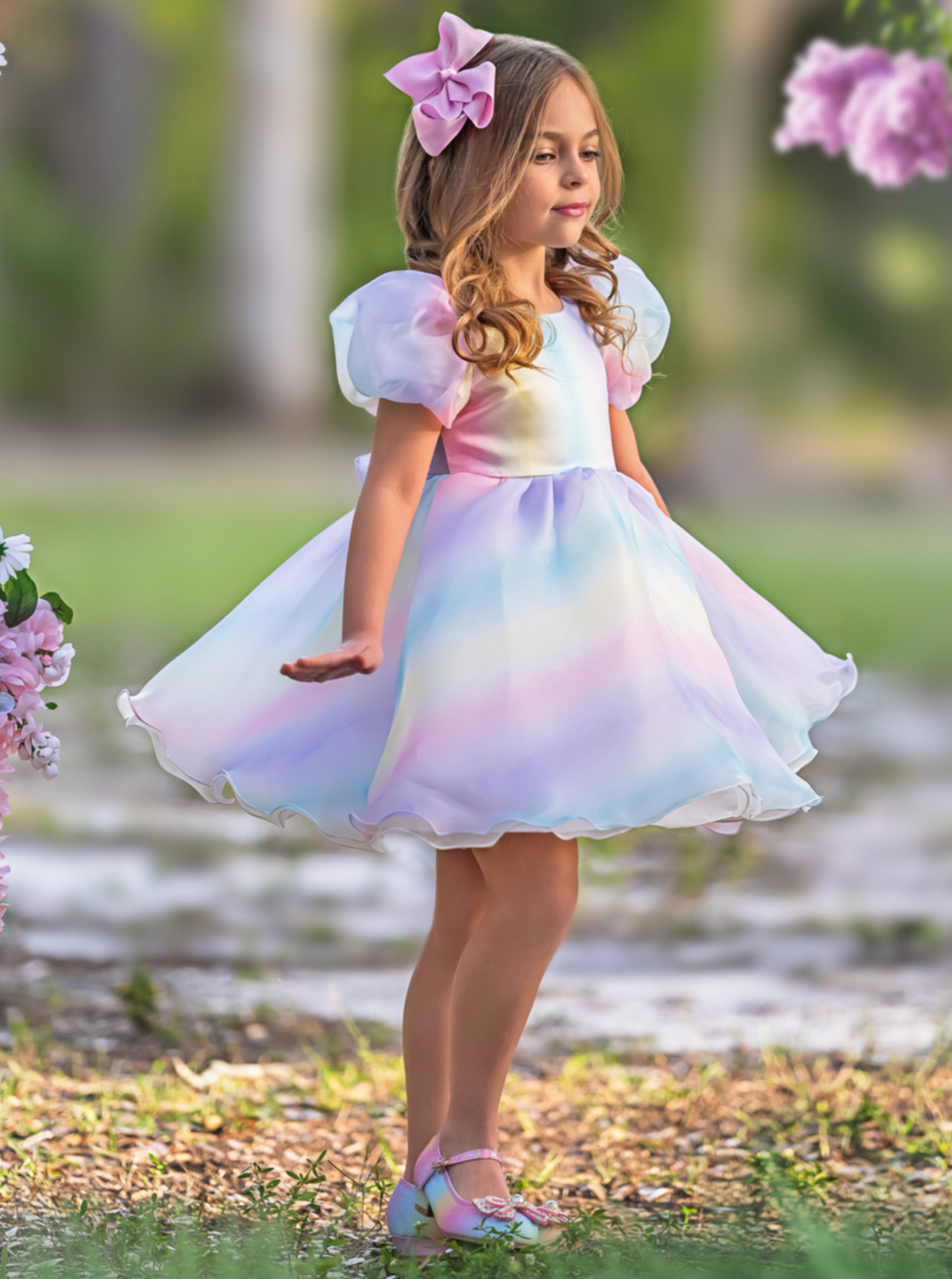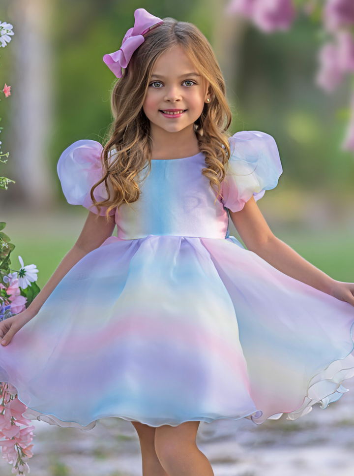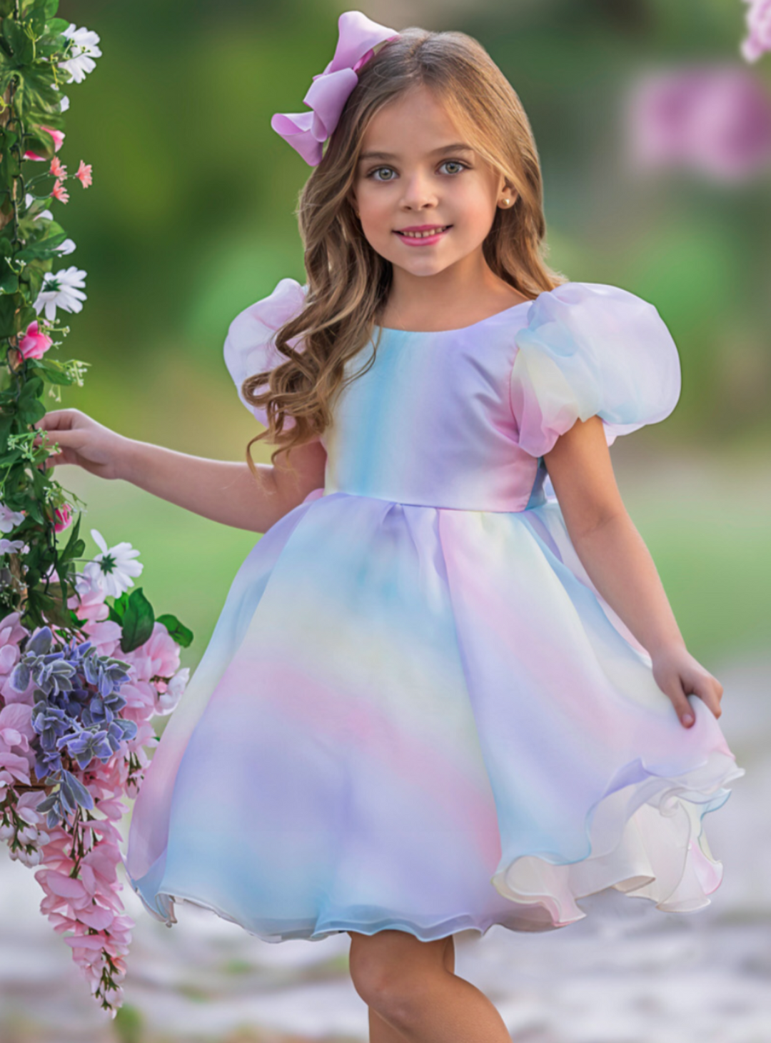 • It's like this pastel puff sleeve dress has been sprinkled with fairy dust! Turn your little fashionista into a magical princess on her next special event. An enchanting whirl of colors and a puffy, twirl-ready silhouette will make her the belle of the ball.