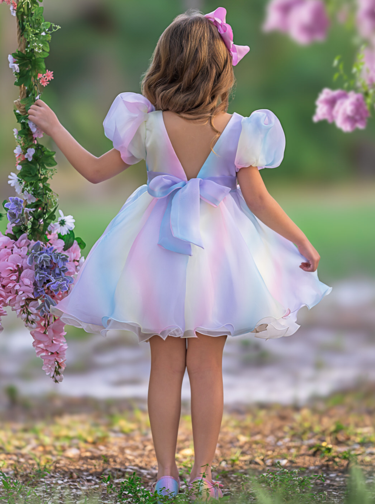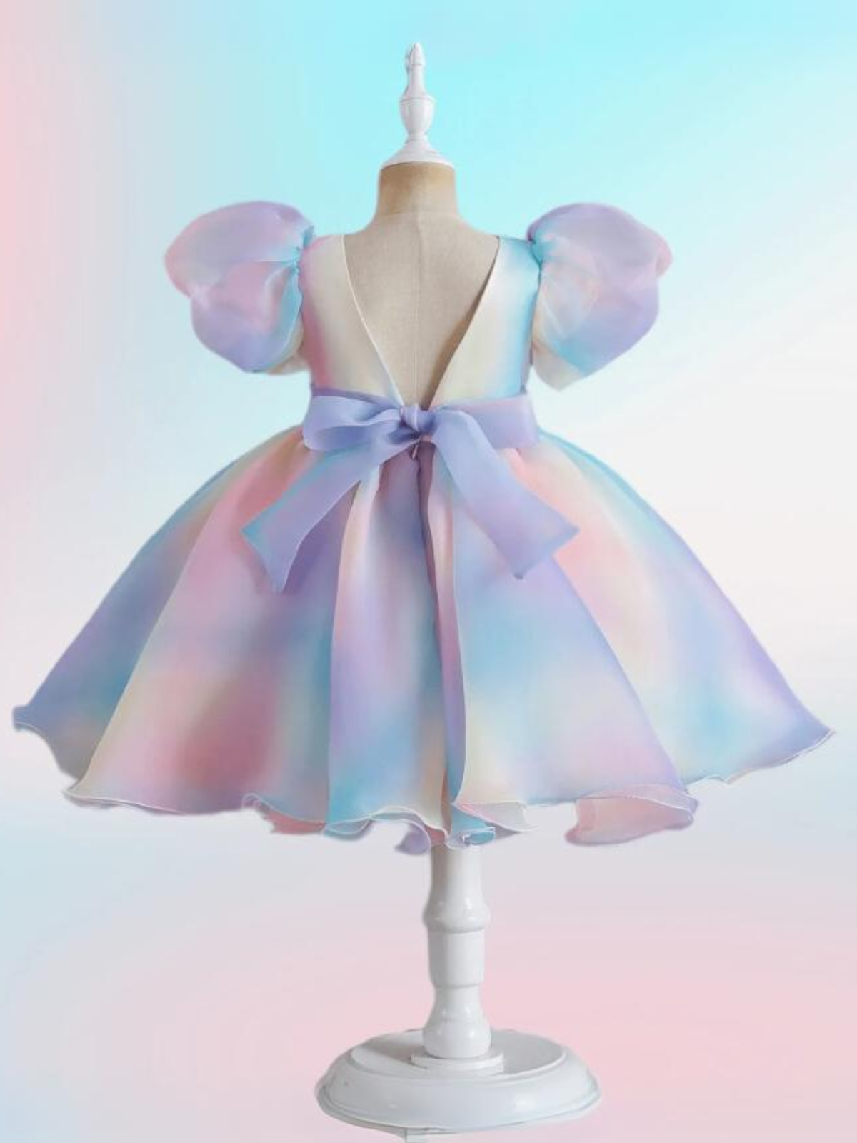 • Pastel rainbow puff sleeve tulle dress with v-back and statement bow back detail