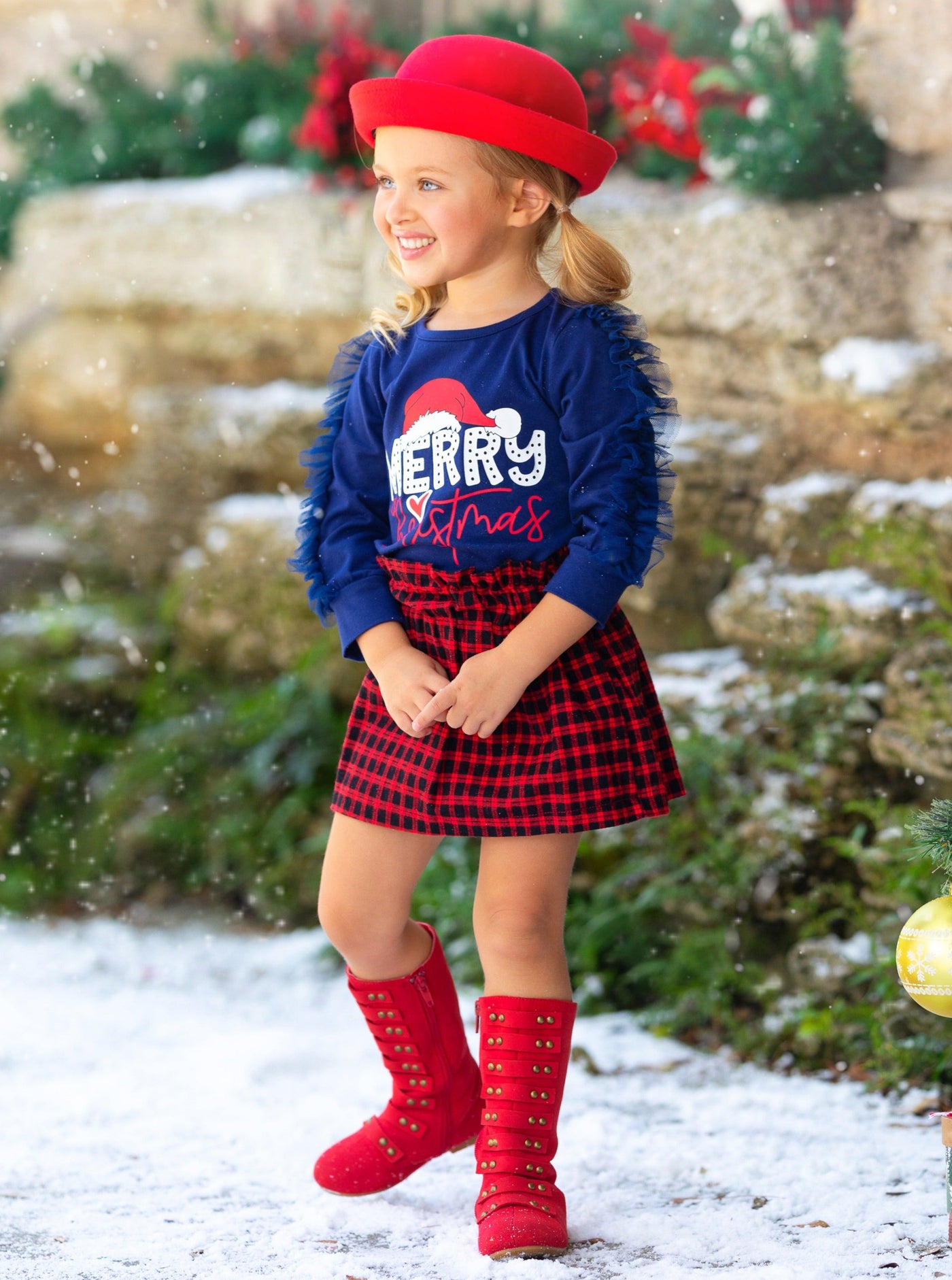 • Cold weather cuteness starts here! Our Merry Christmas top and checkered skirt set make sure she is the most adorable little girl in the room. Its festive print and chic design make this pairing totally grab-worthy.