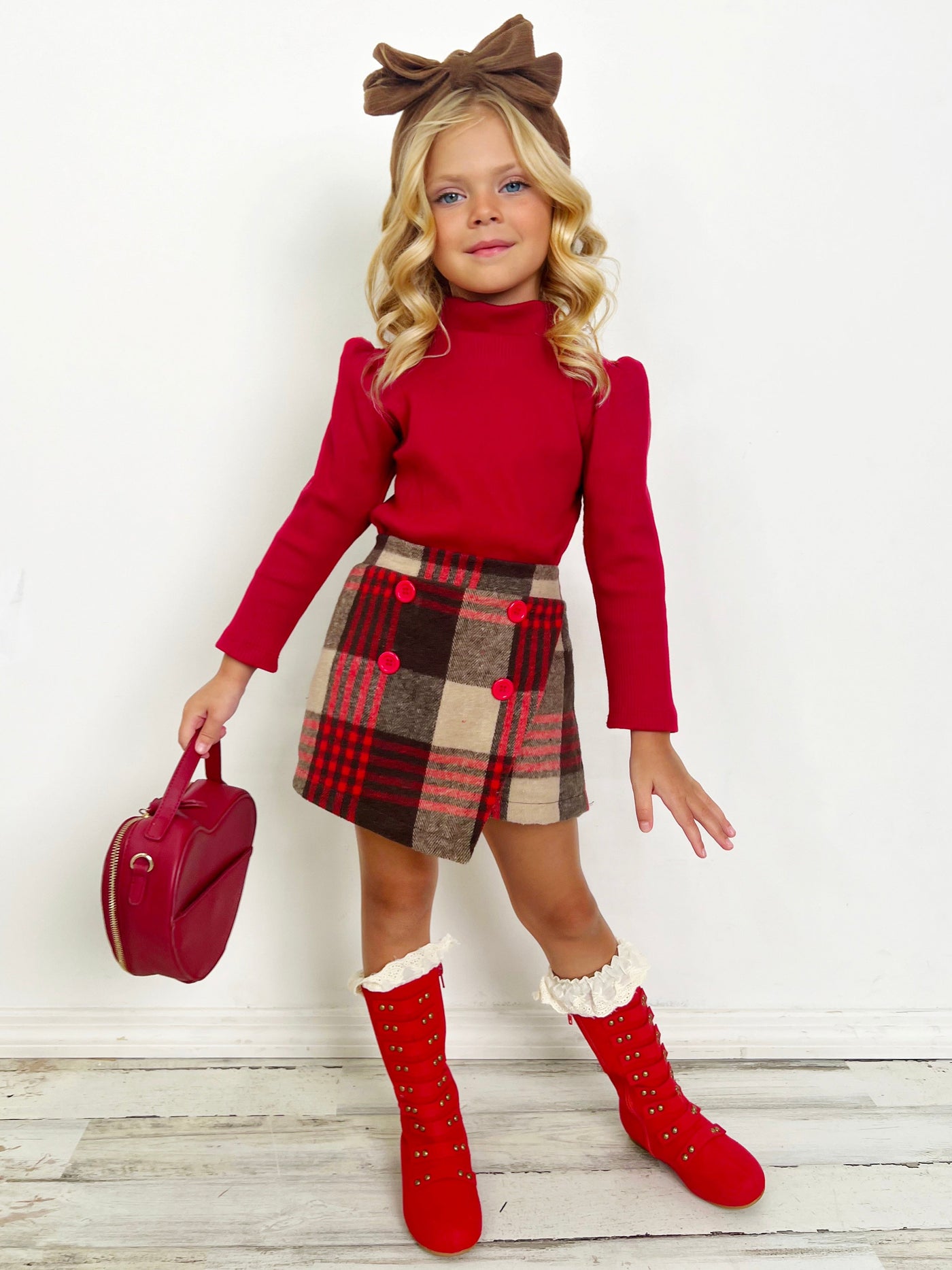 - Your little girl will look picture-perfect in our turtleneck knit sweater and checkered skort set. The rib knit top features puff sleeve details while the stylish skort has button accents. Guaranteed to make her stand out in style!