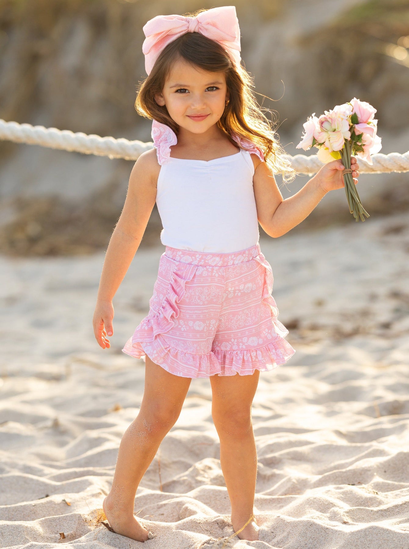 Set includes white top with pink ruffle sleeve detail and pink patterned shorts with ruffle details