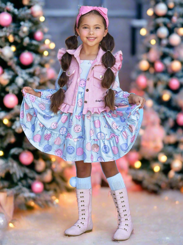 - Your little girl will be radiating in our denim vest and ornament dress set. This fun pairing features a beautiful mix of light blue and pink, Smiley icon ornaments, and ruffle details to show off her bright personality. This sweet stand-out looks great, no matter the occasion.