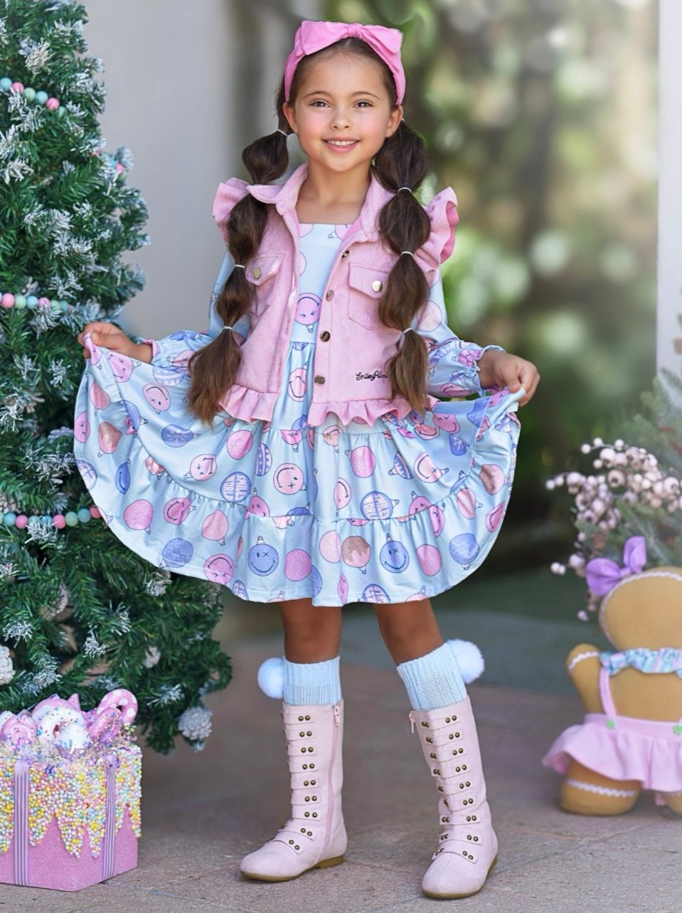 - Light Blue ruffle dress with SmileyWorld® icon ornament print and Pink denim vest.