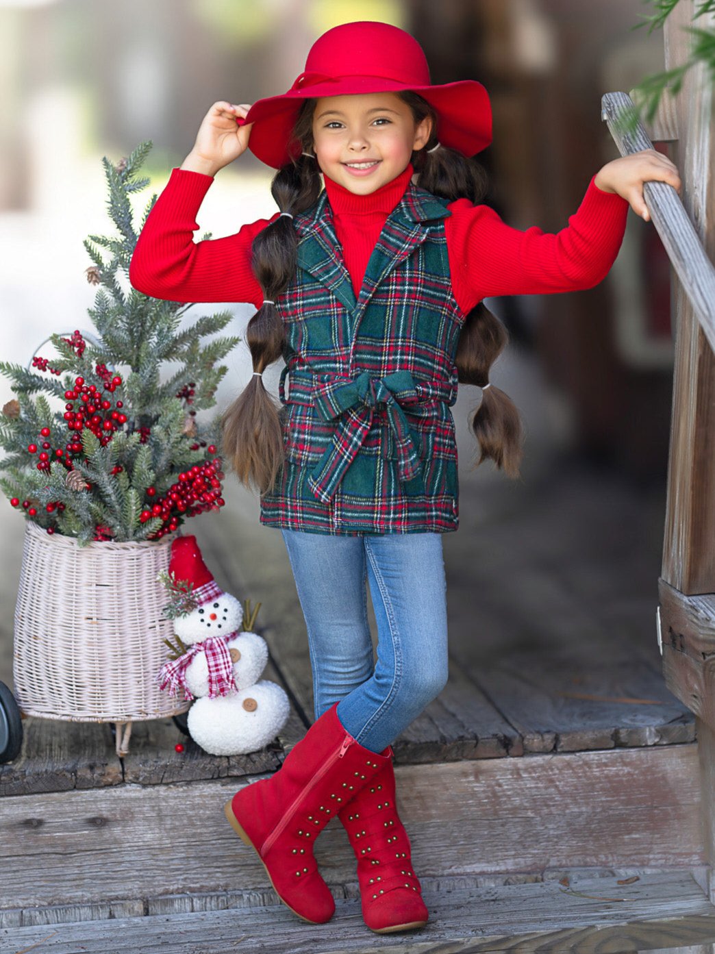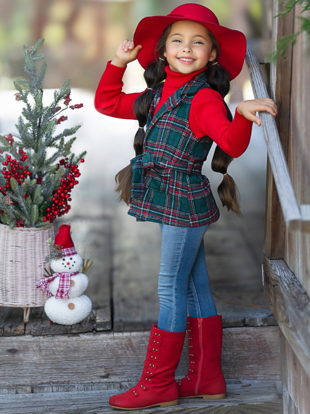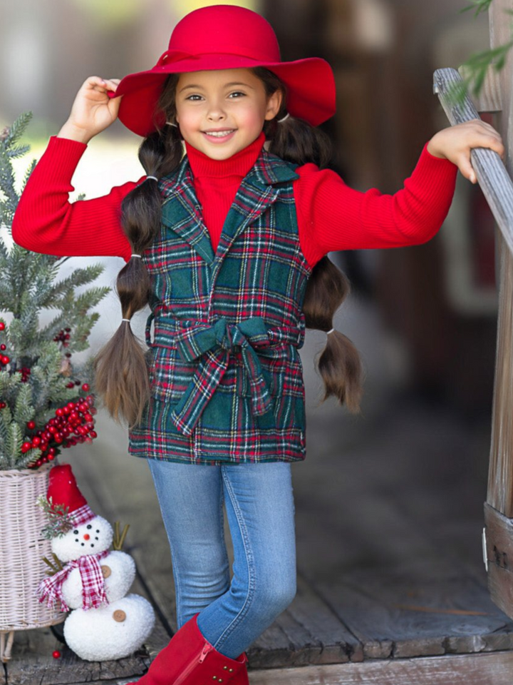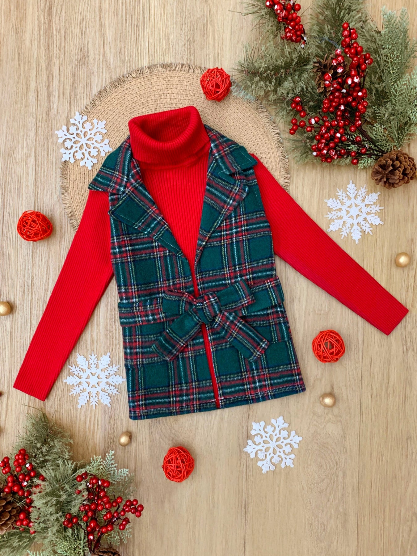 Festive Flair Plaid Belted Vest and Red Turtleneck Top Set