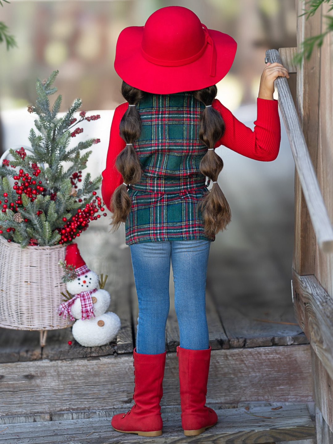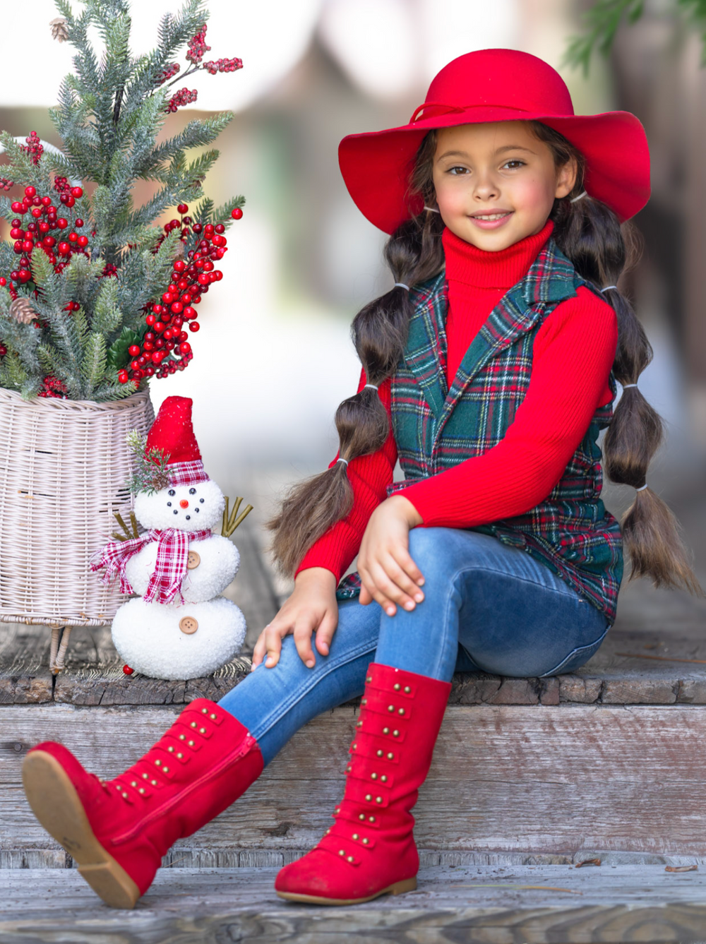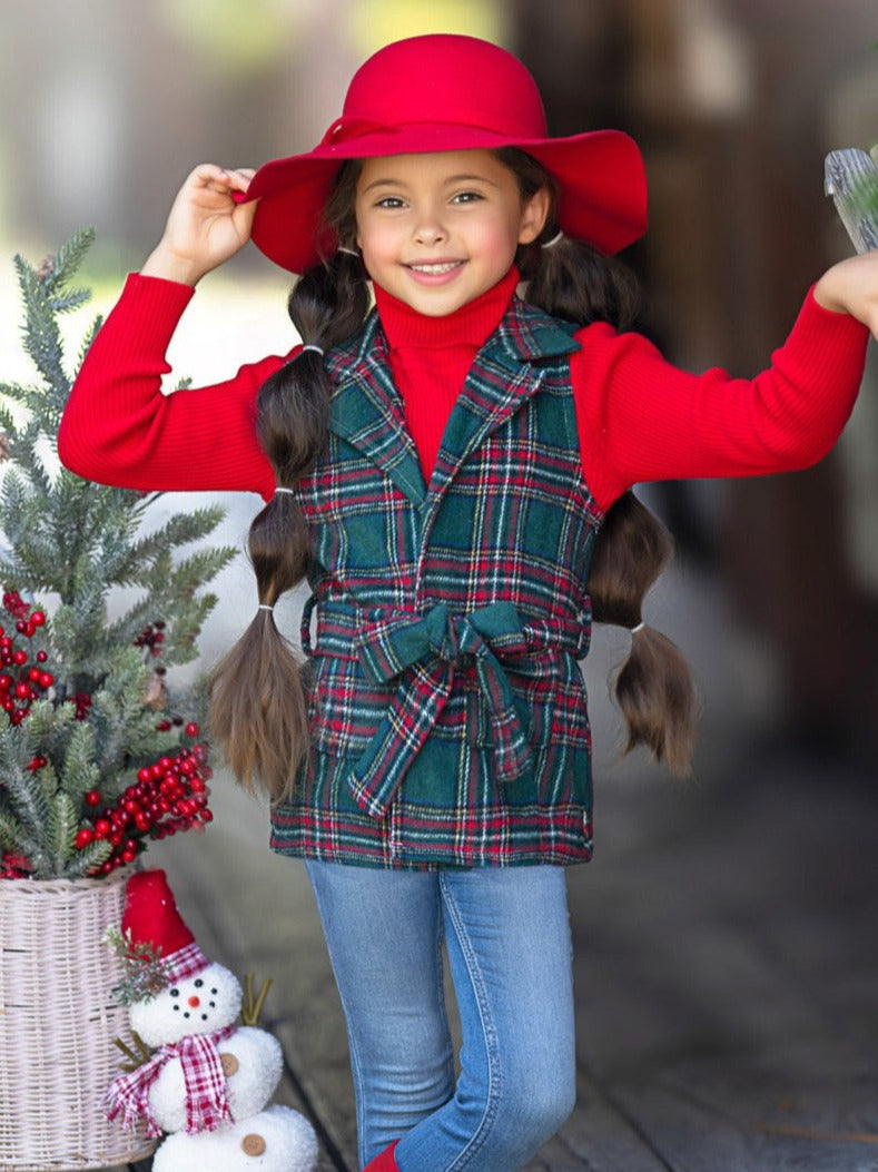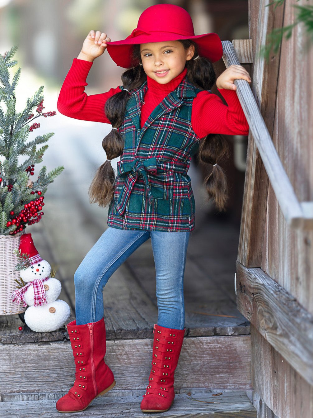 Festive Flair Plaid Belted Vest and Red Turtleneck Top Set