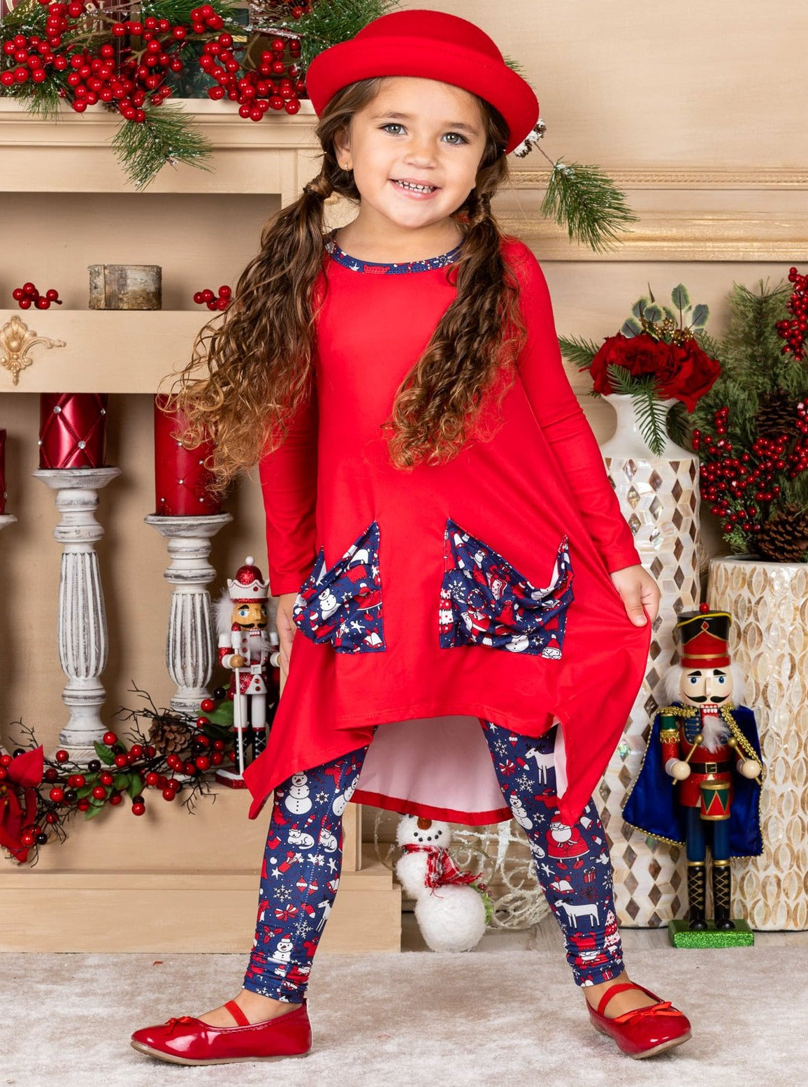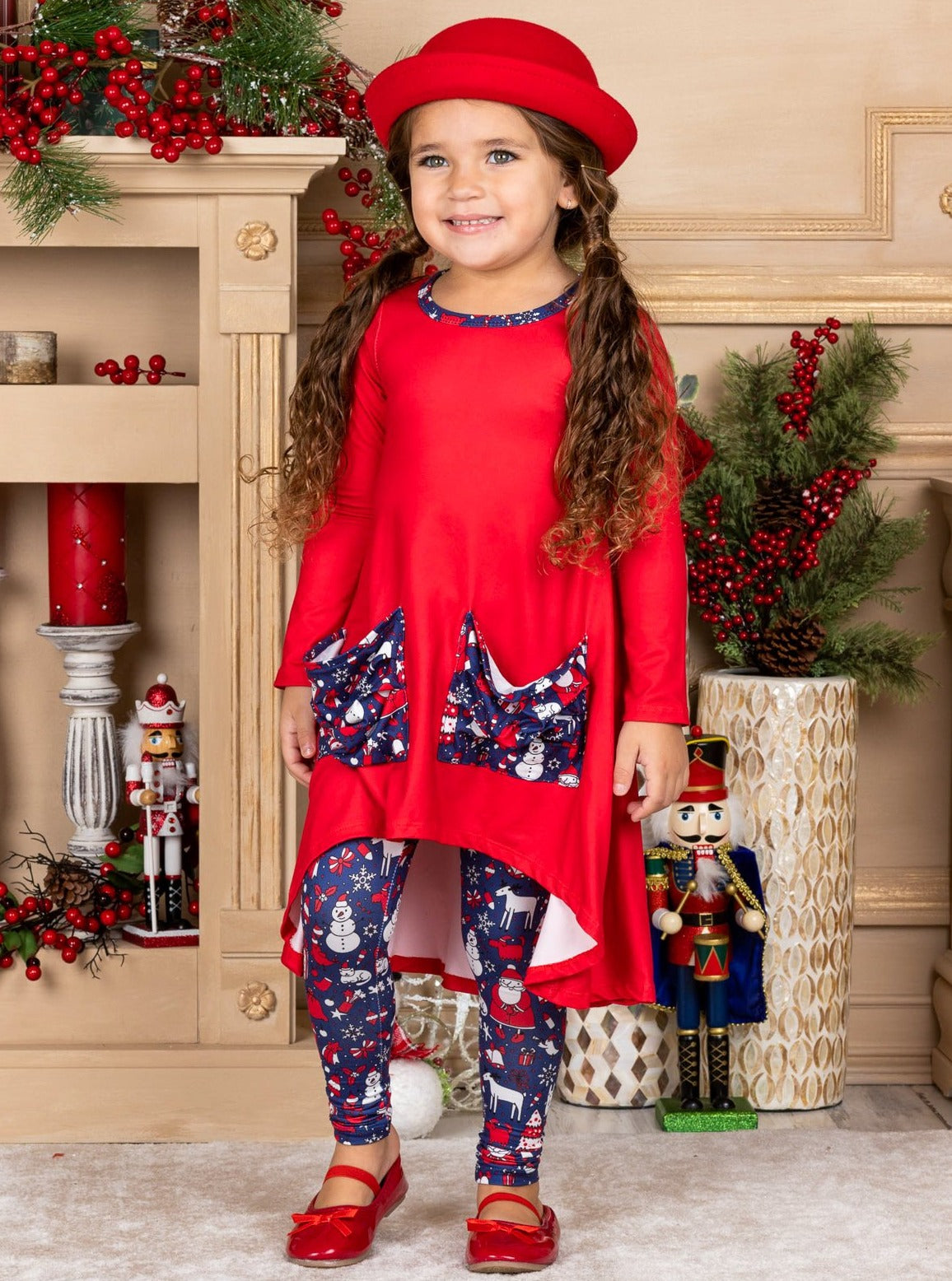 • She'll be effortlessly coordinated all Winter long in this soft hi-lo tunic and leggings set. Convenient baggy pocket's festive patterns perfectly match the leggings that contrast the gorgeous long-sleeve tunic.