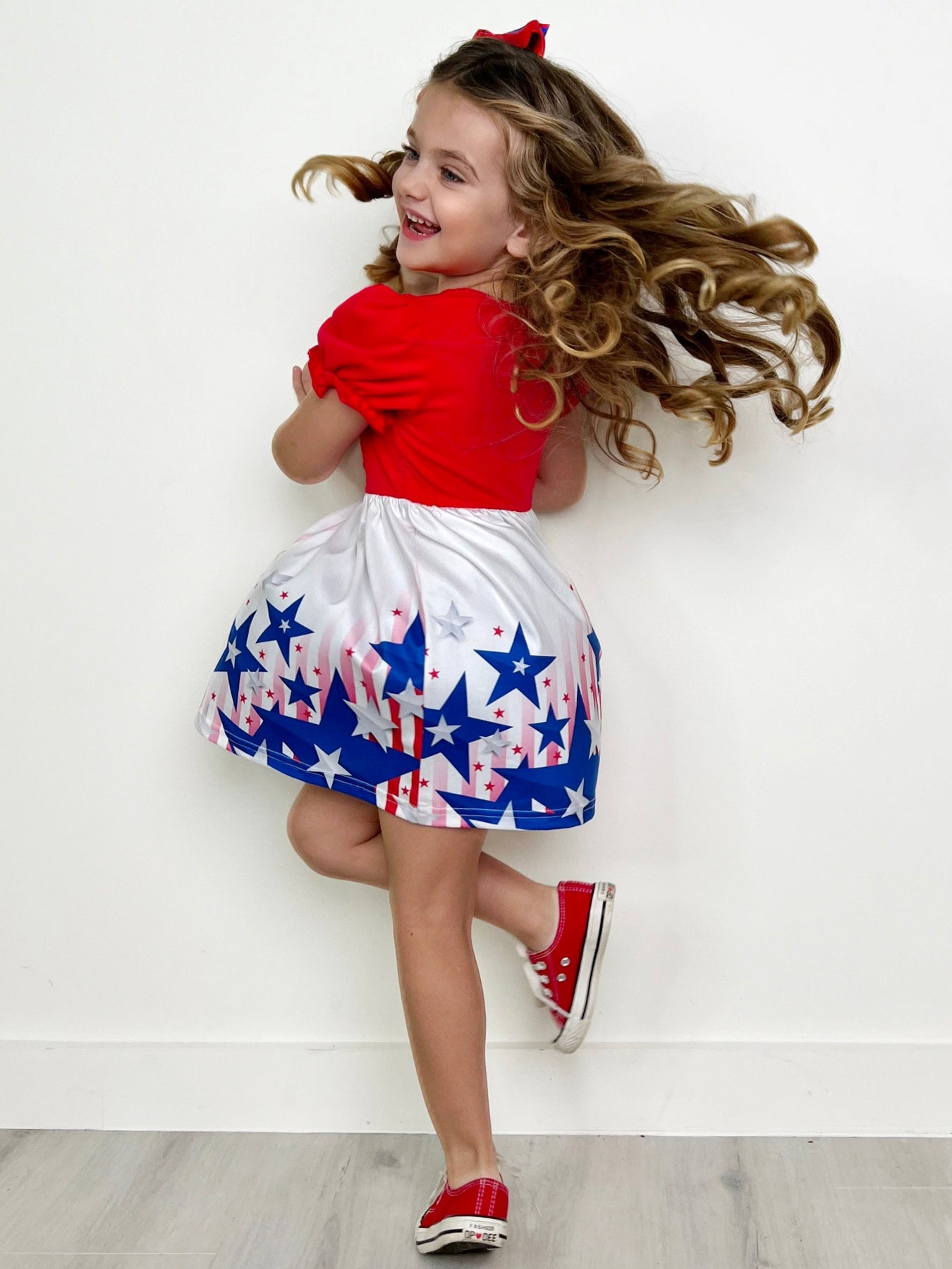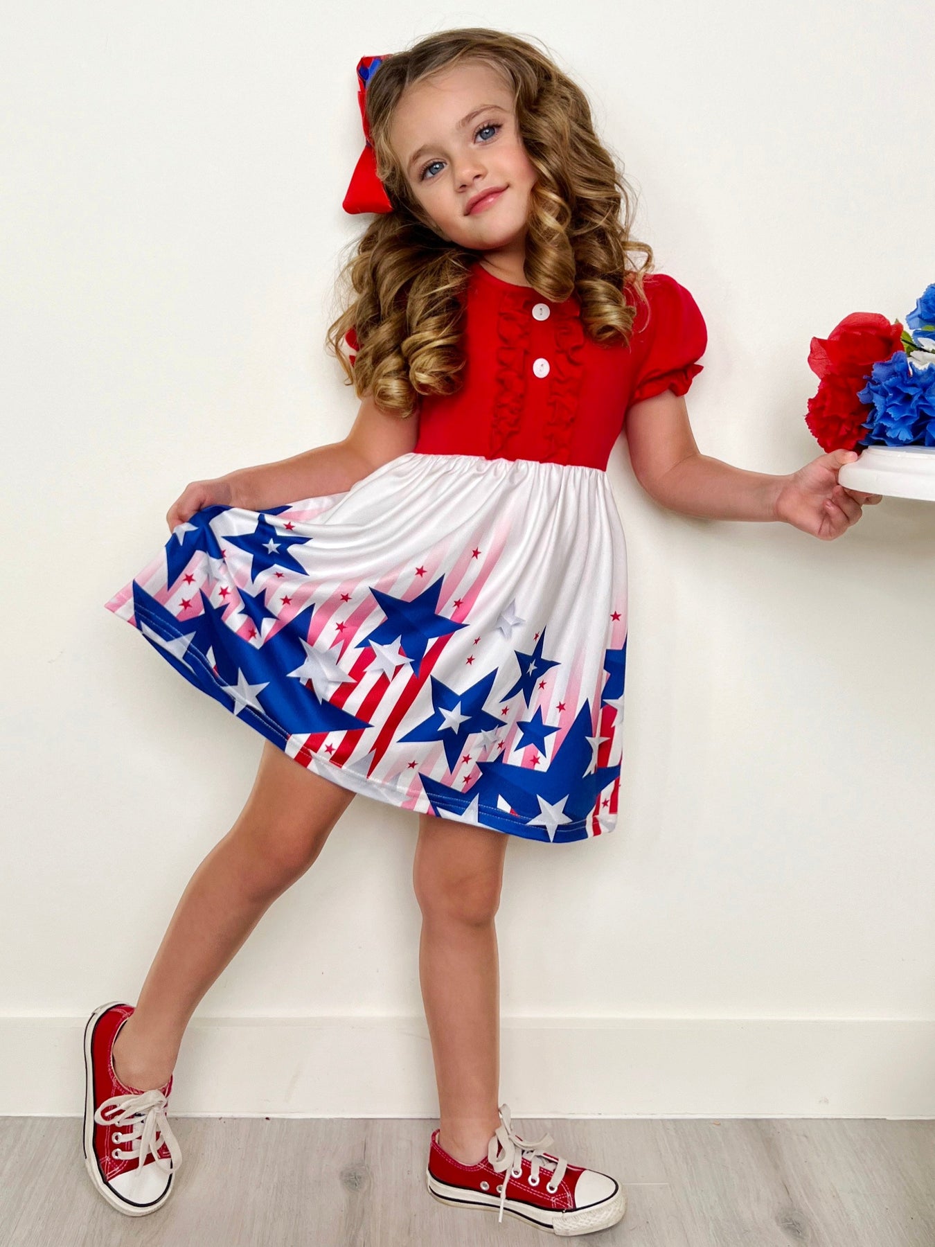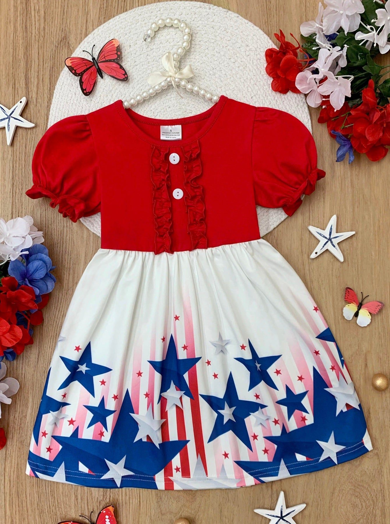- Puff sleeve dress with red bodice, ruffle and button accents, elastic waistband, and a white skirt with stars and stripes graphic print