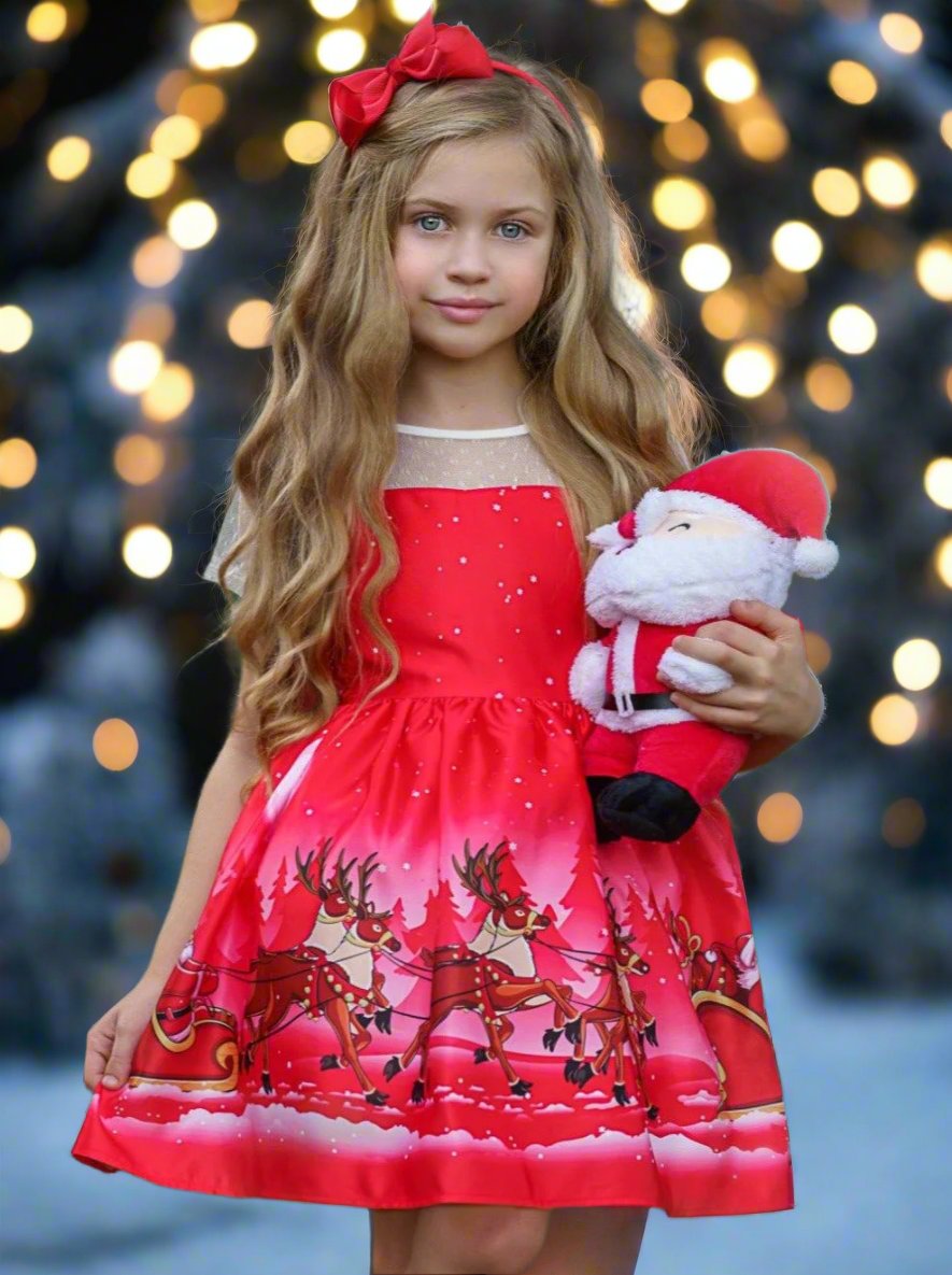 - Your girl's winter wardrobe won't be complete without our sensational holiday dress for all her special occasions. The yoke neckline creates a sheer effect on the shoulders for an ultra-flattering silhouette. And watching Santa and his reindeer take flight as she twirls will be the highlight of any Christmas event!