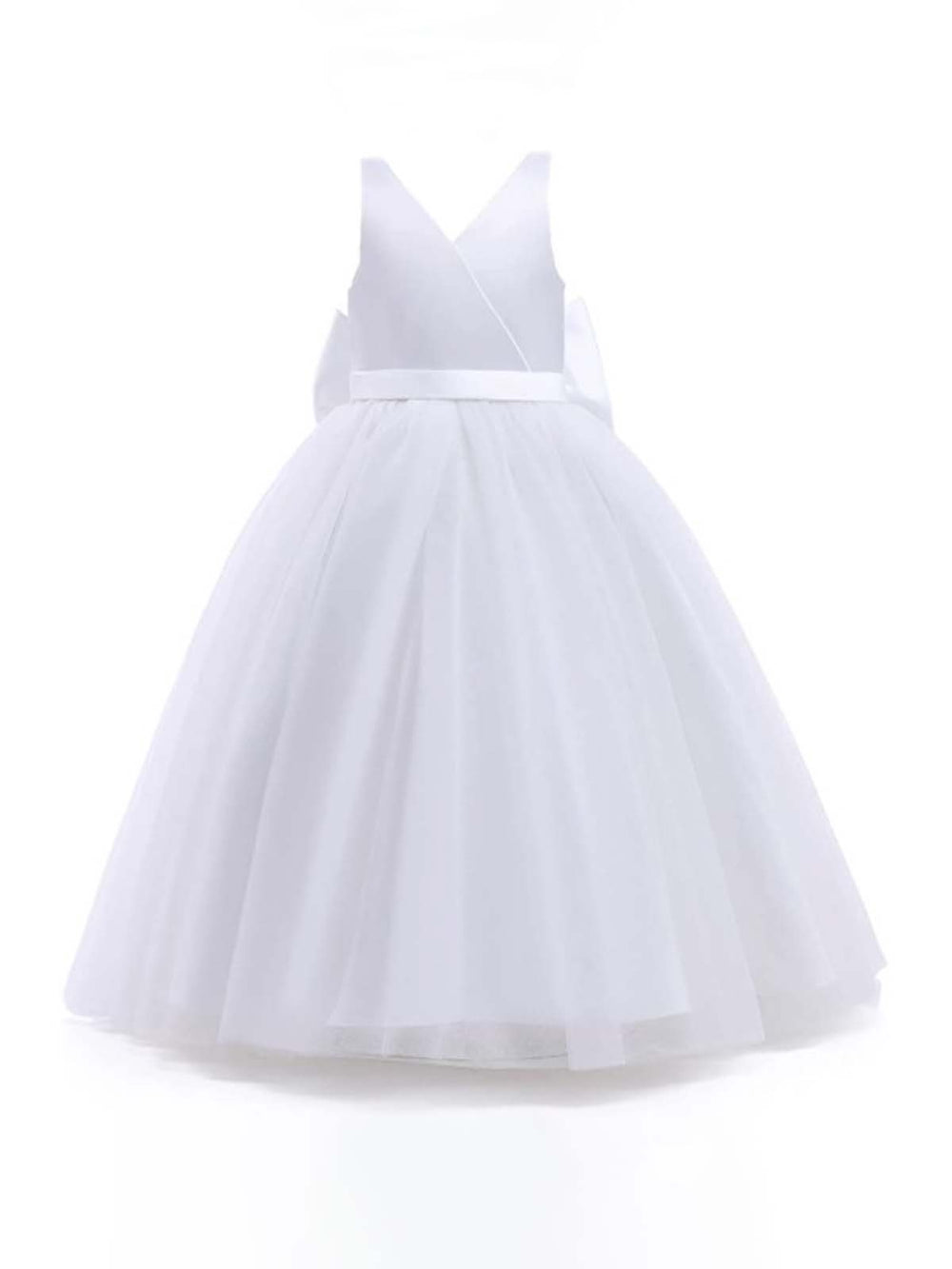 - Your little lady will step out in elegant style in this sleeveless v-back white gown. Clean lines and simple details make this dress effortlessly chic and beautiful. She'll be walking with grace and confidence in this stunning piece!