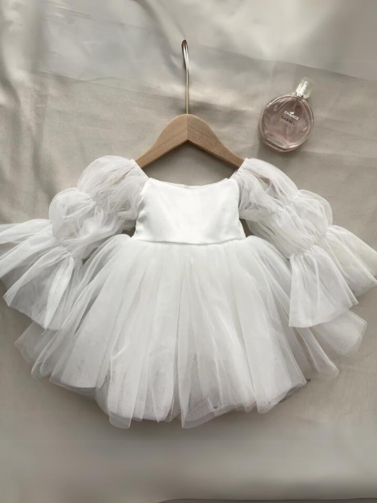 • Puff sleeve tulle dress with satin bodice, tie-back detail, and pearl buttons