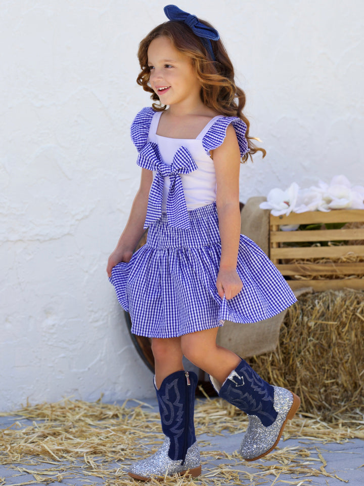 Features a crisp white top with ruffled gingham straps and an oversized bow for a cute, country-inspired look