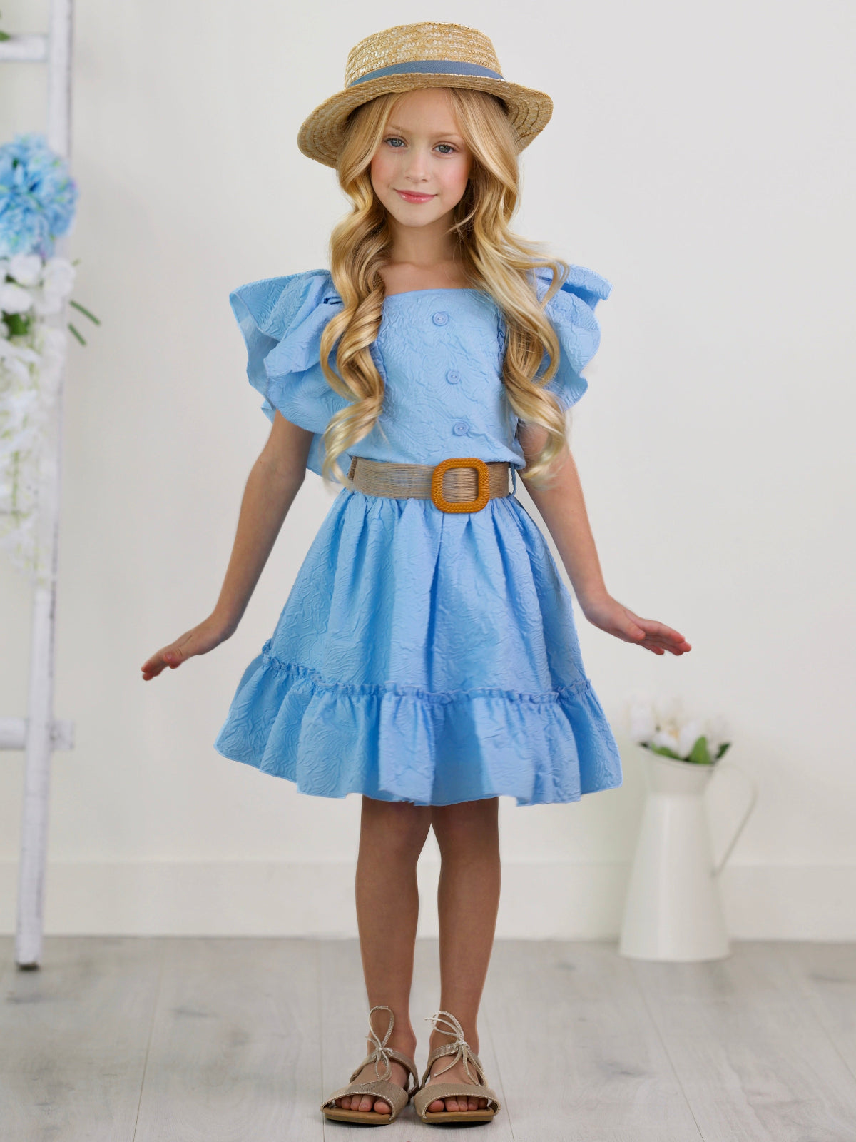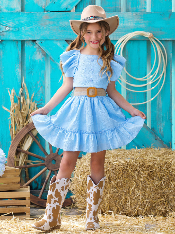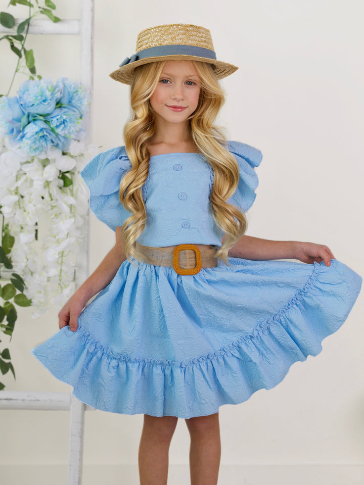 Sky Blue Ruffle Sleeve Belted Skirt Set