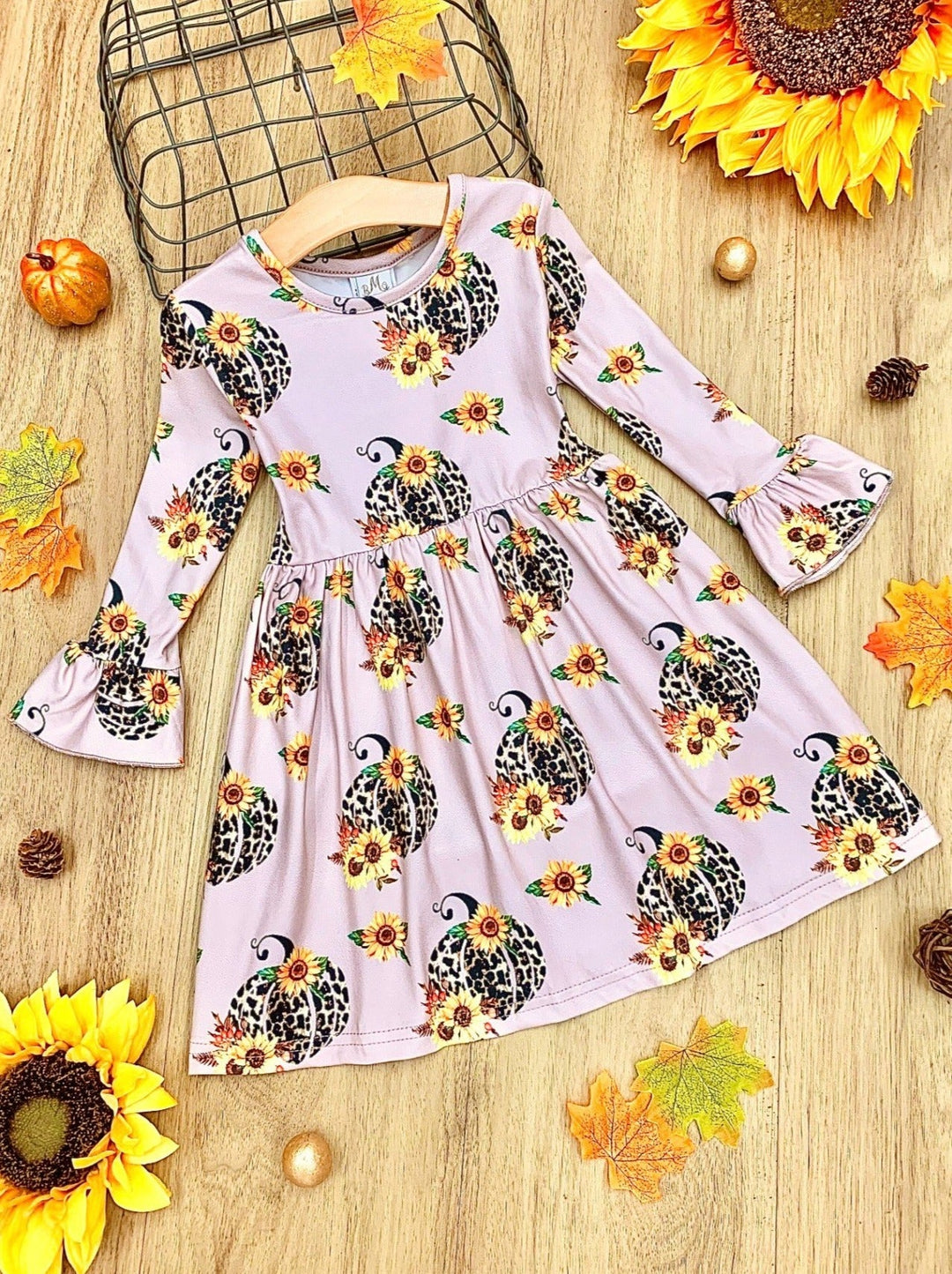 Fall Outfit | Leopard Print Pumpkin Pleated Dress | Cute Girls Clothes