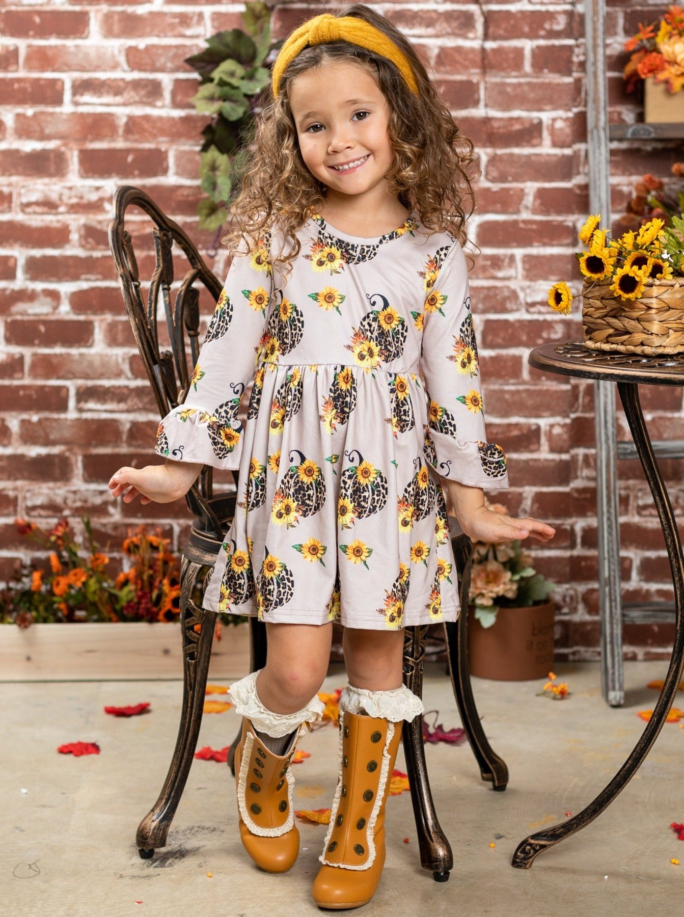 • Leopard print, pumpkins, and sunflowers--oh my! Can you think of a more cute combination for this couture girl's floral Fall dress? Neither can we! The light-colored background allows the leopard print pumpkins adorned with vivid sunflowers to take centerstage.