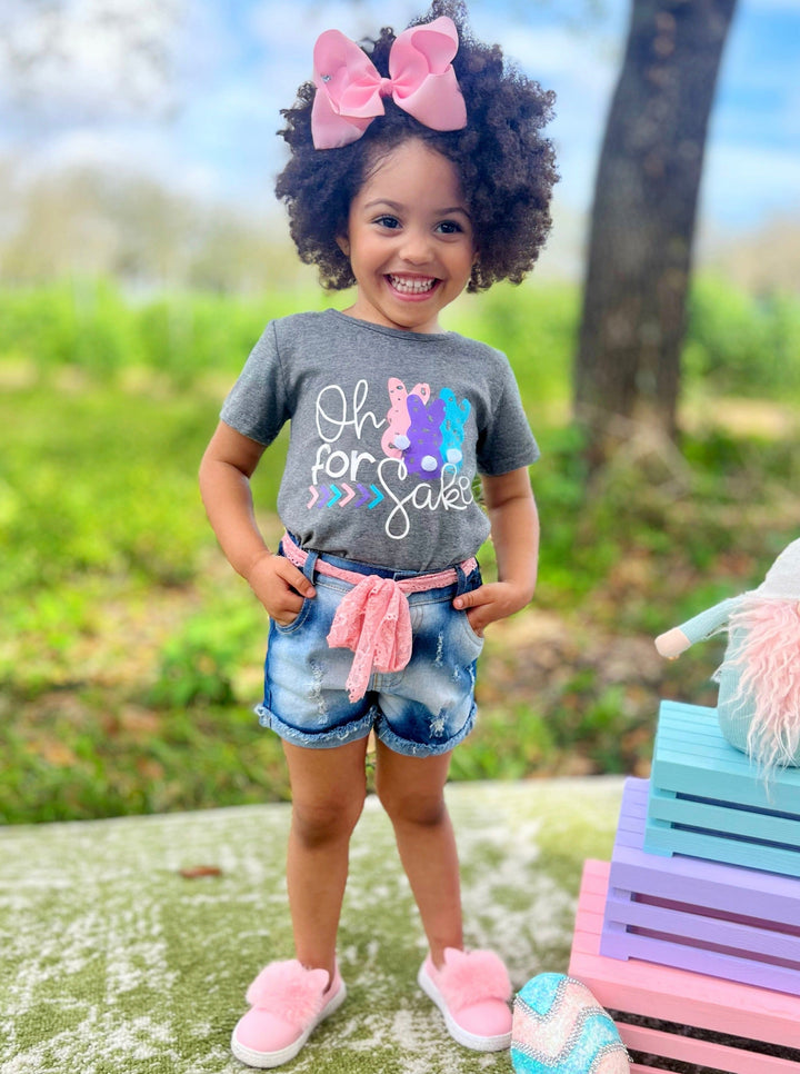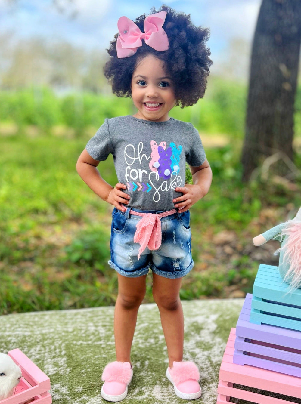 Oh for Bunnie's sake, let go on an Easter hunt and find all those eggs wearing this adorable graphic tee and denim shorts set. Now your cutie can have her own special pair of acid-washed fringed denim topped with a lace bow belt. The stylish bunny graphic on the grey top will make this an instant Spring favorite.