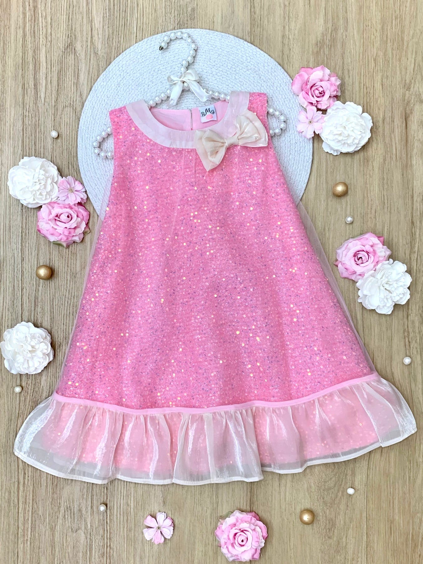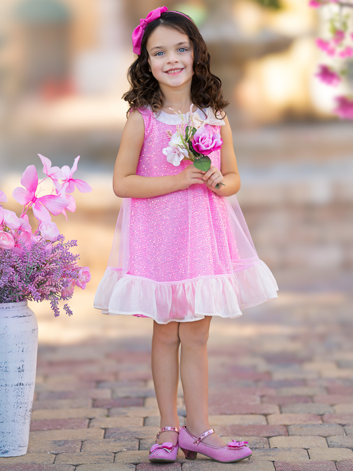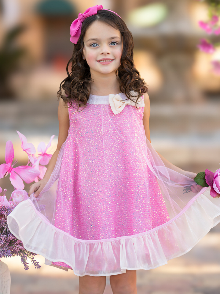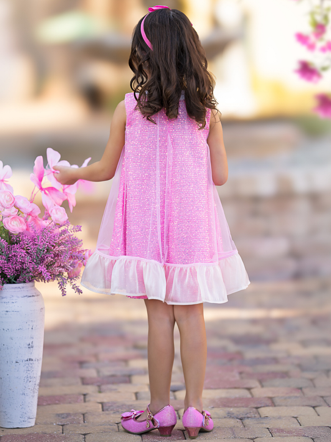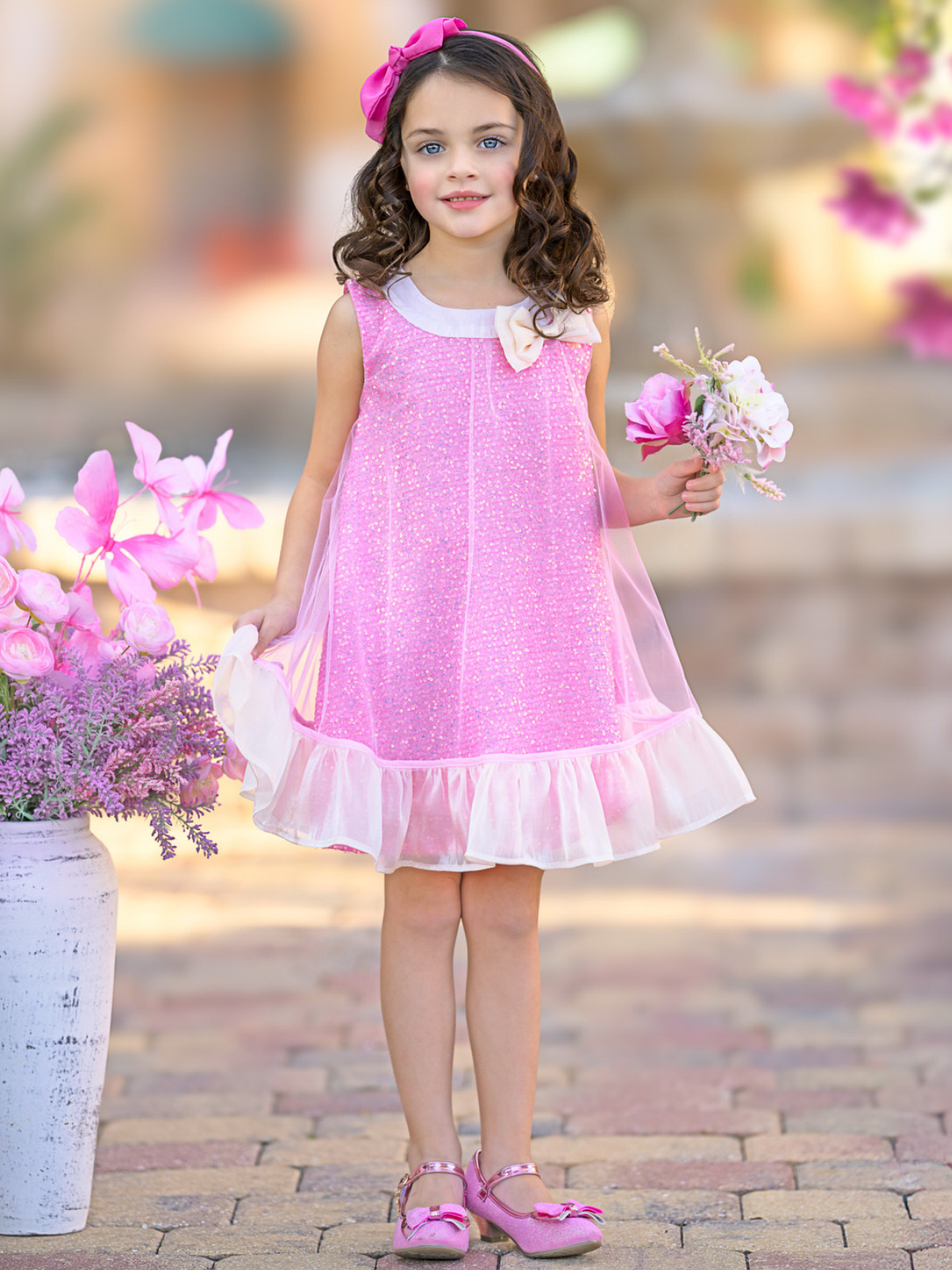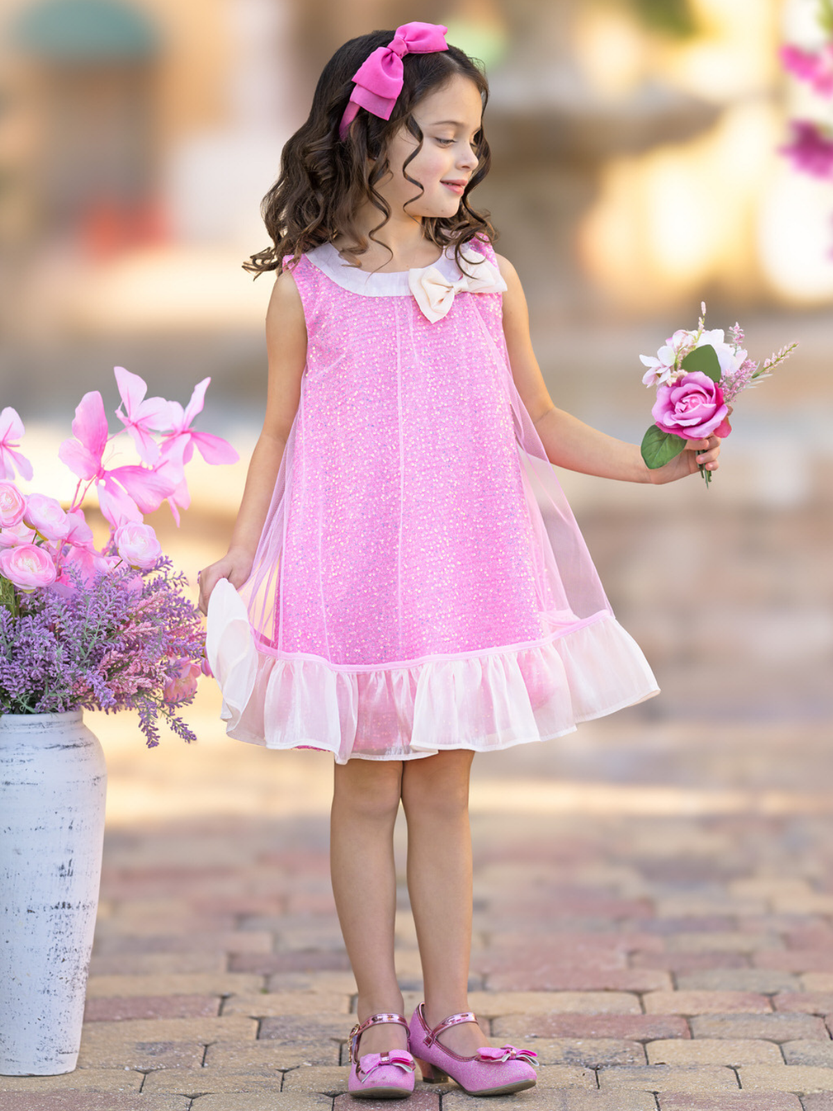 Make her sparkle in this charming pink party dress, adorned with glittering details and delicate accents, perfect for birthdays, tea parties, and special occasions.