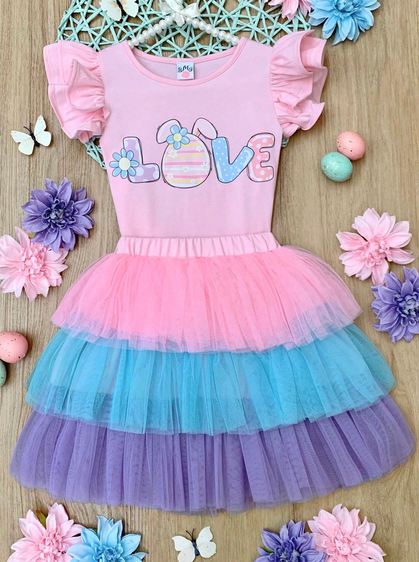 Girl wearing a pastel tiered tulle Easter dress with colorful layers for spring celebrations