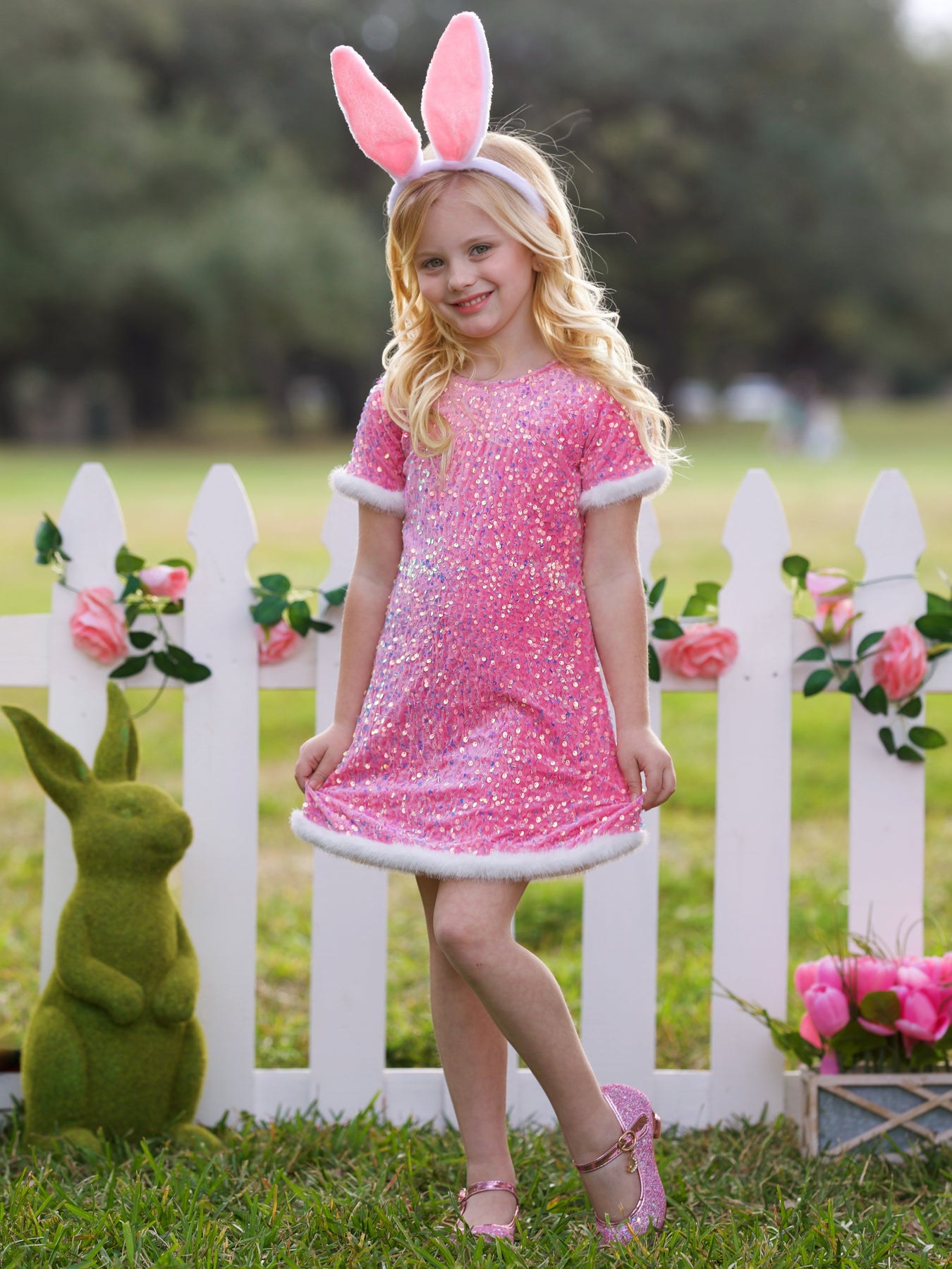 Let her shine this season in this dazzling Easter dress for girls, featuring vibrant pink sequins and soft faux fur trim for a cozy, magical finish. Designed to sparkle in the spring sunshine, this girls Easter dress is perfect for egg hunts, family photos, and festive Easter celebrations.