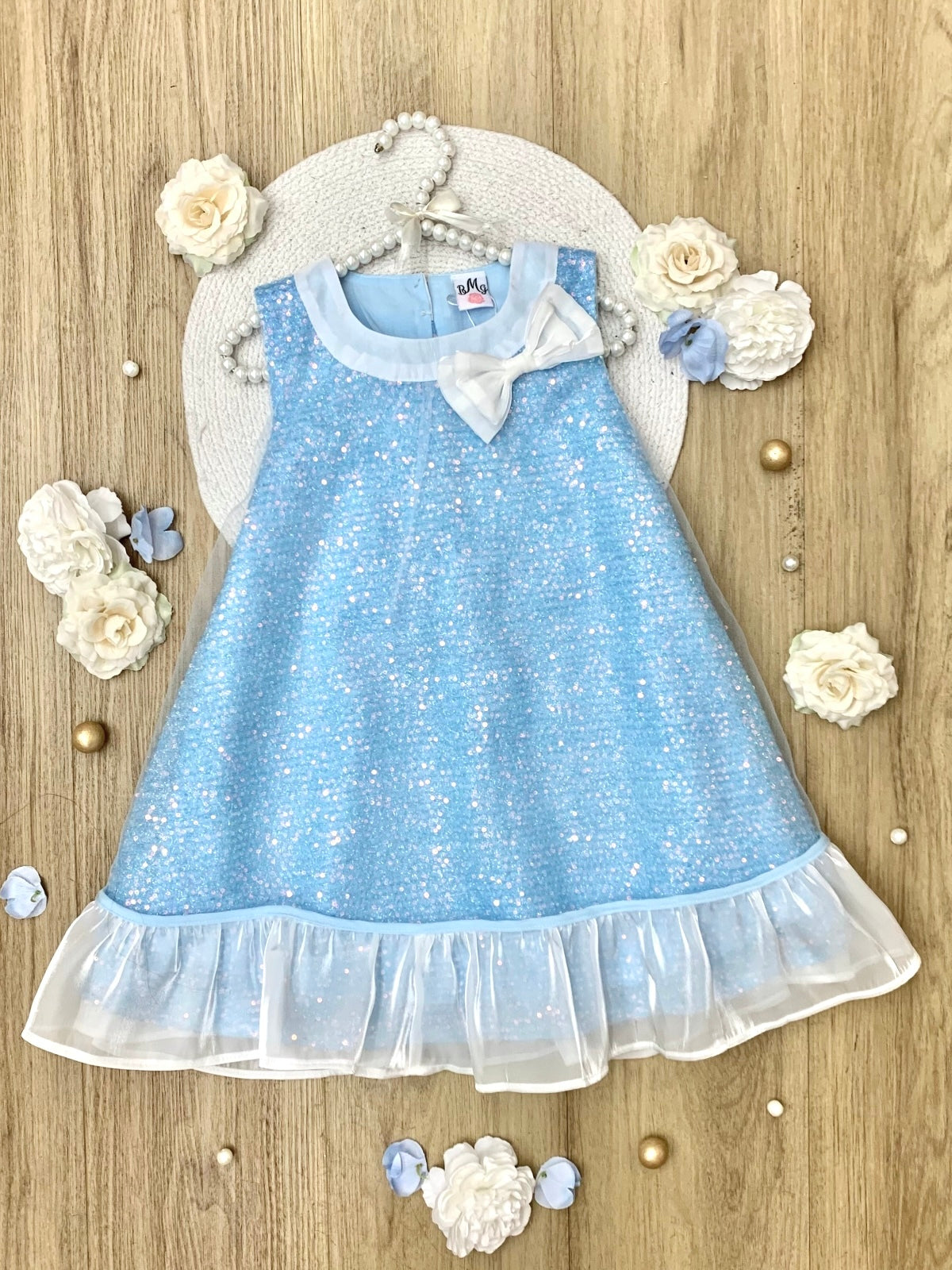 - Glittery blue fabric that sparkles beautifully in the light, with a charming bow accent on the collar.