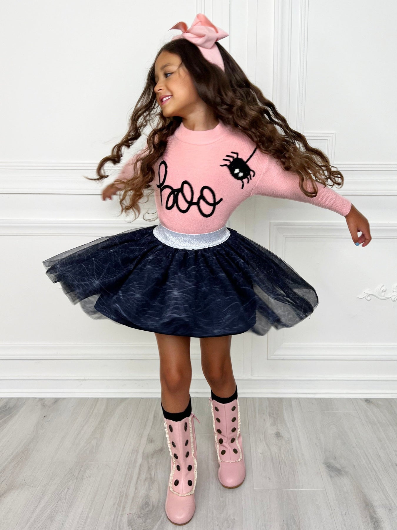 - Spooky cute Halloween "Boo" top and spider web tutu skirt set for a festive and stylish look