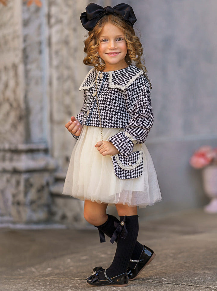 • Treat your fave girl to a wardrobe update! Our black houndstooth blazer and dress set is perfect for your little one's OOTD snaps. The chic blazer features a statement collar, while the matching dress has the prettiest tutu skirt. Perfect for all-day twirls! Comes with the cutest mini houndstooth crossbody purse to store her essentials.
