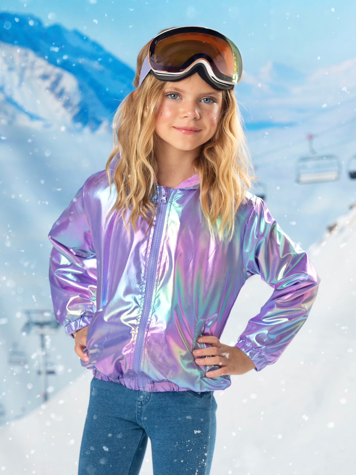 Let her shine bright in chilly weather with this dazzling lilac holographic jacket — where fashion meets warmth in the most magical way!