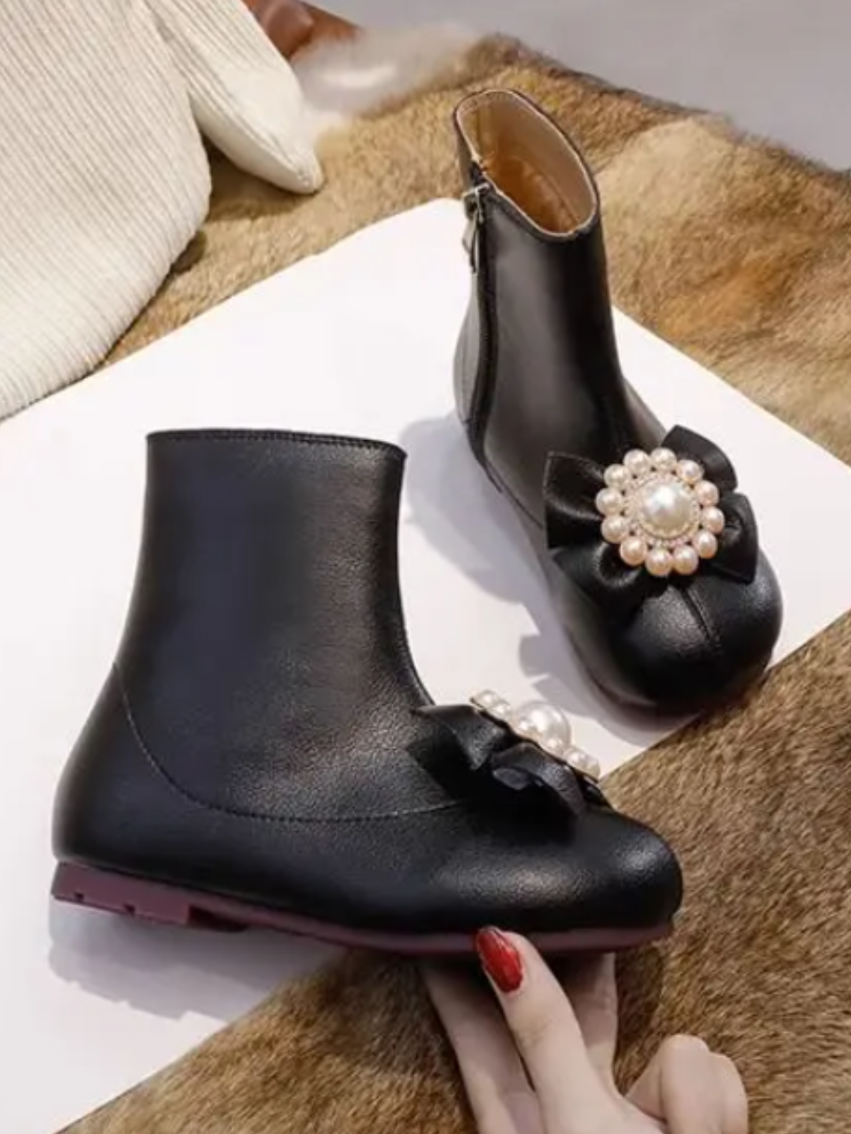 • Modern and elegant, these pearl bow ankle boots will inspire your fashionista to make the world her runway. Your mini model will love practicing her catwalks!