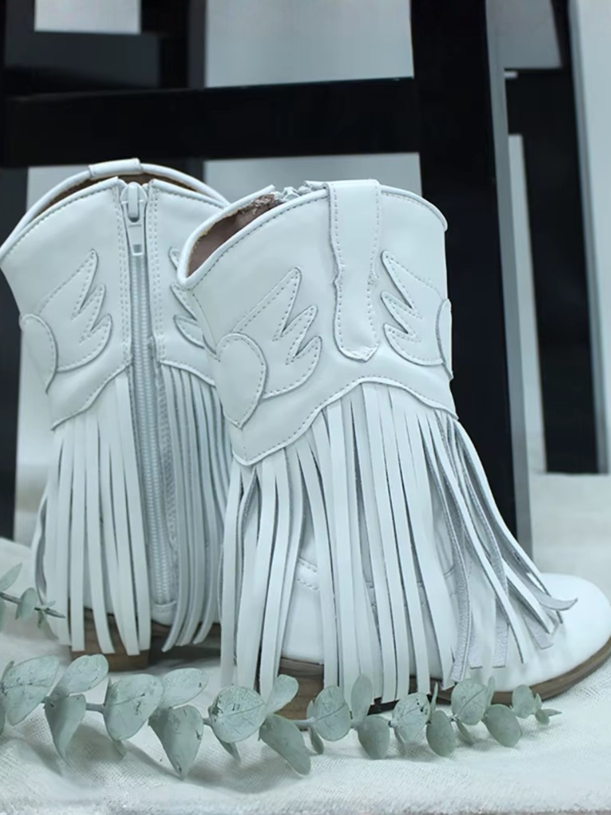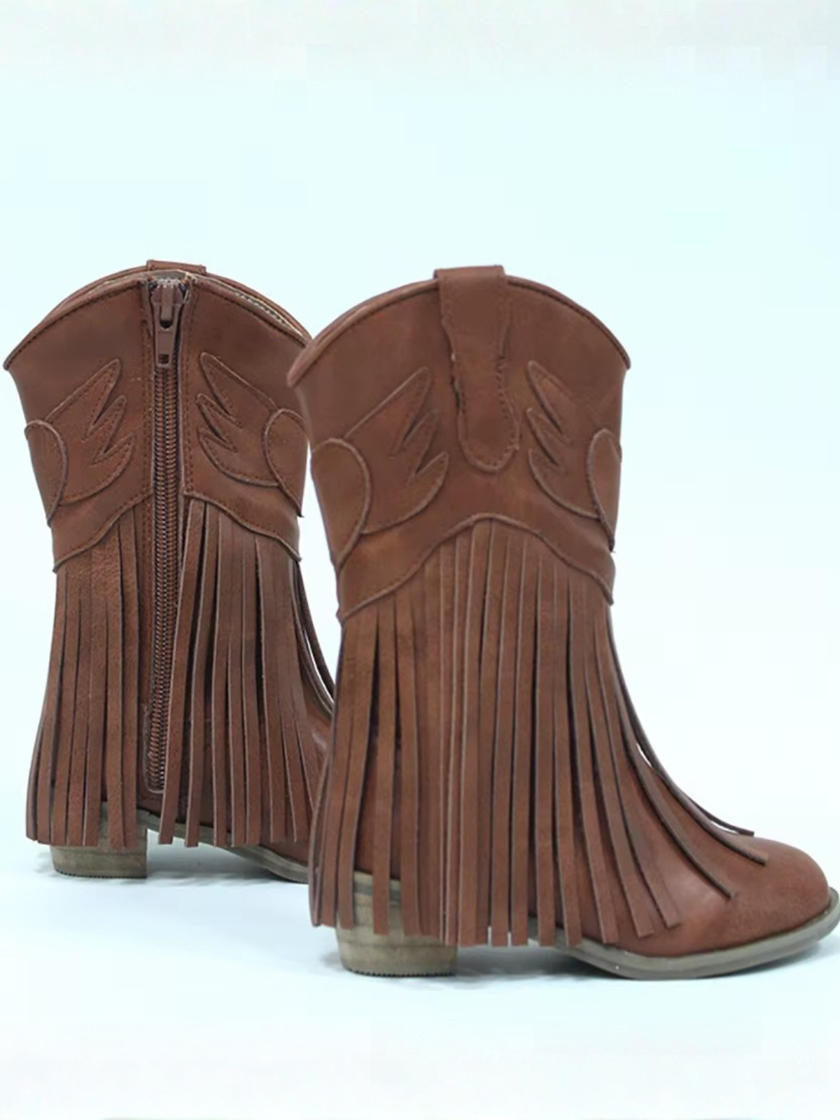 • Cowboy boots with stitching details, long fringe accents, and side zip closure