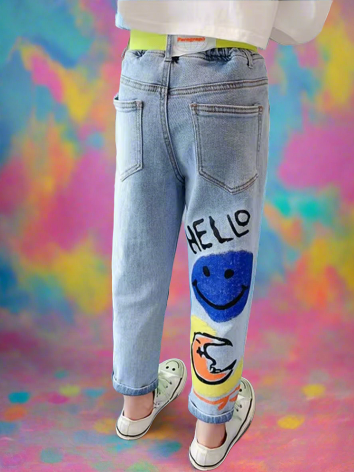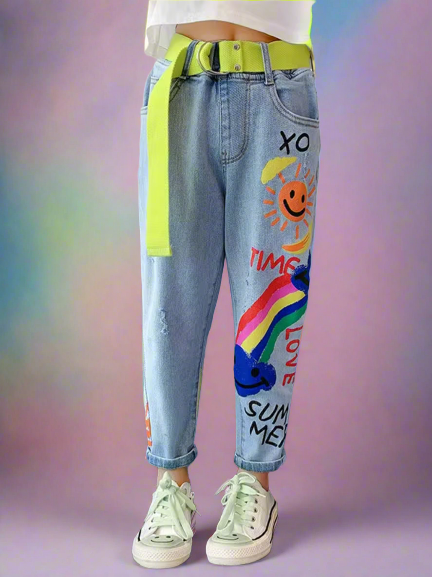 Girls Trendy Graffiti Smiley Rainbow Jeans