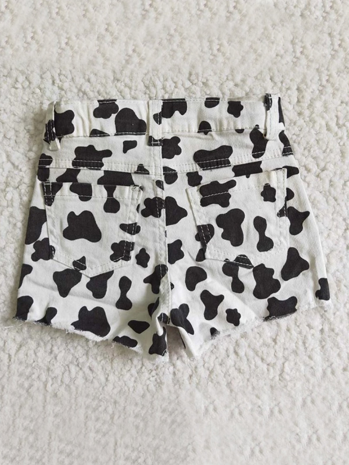 - Is your child expressive and fun? These cow print distressed shorts are just perfect for her! With an eye-popping print and a stylish fit, her casual days will never be boring again. Perfect for country-chic looks!