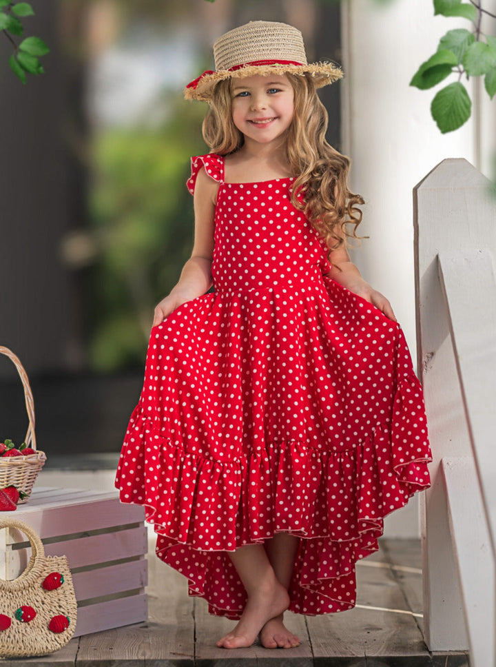 • Let's add sass to her sweetness with this red polka dot hi-lo ruffle dress. A showstopping frock is just what she needs to welcome spring in style. She'll be turning every day into a fashion show!