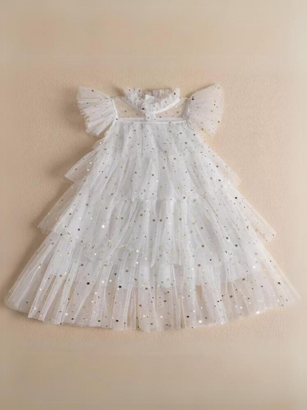 - Tiered tulle dress with star sequin details and flutter sleeves