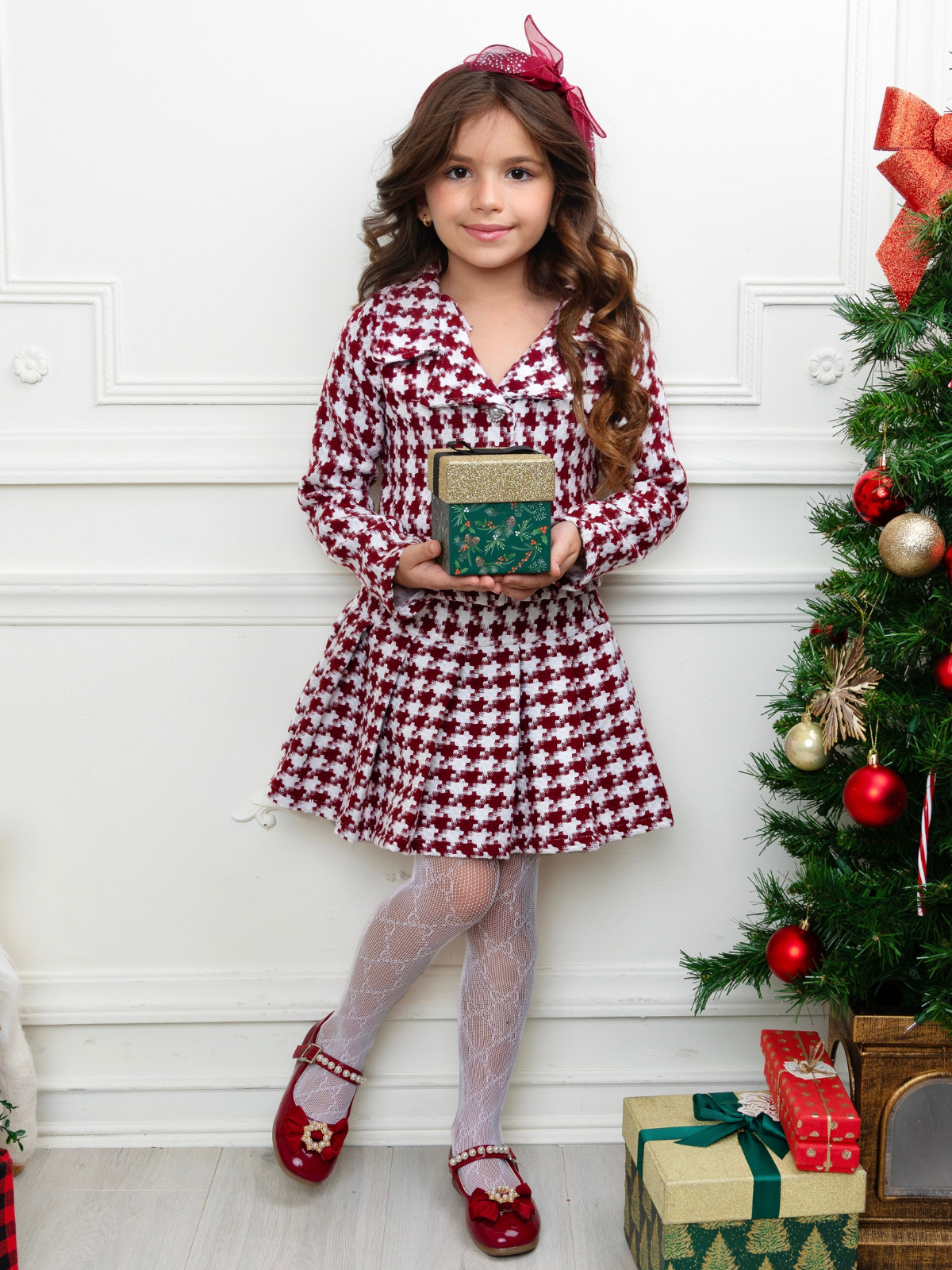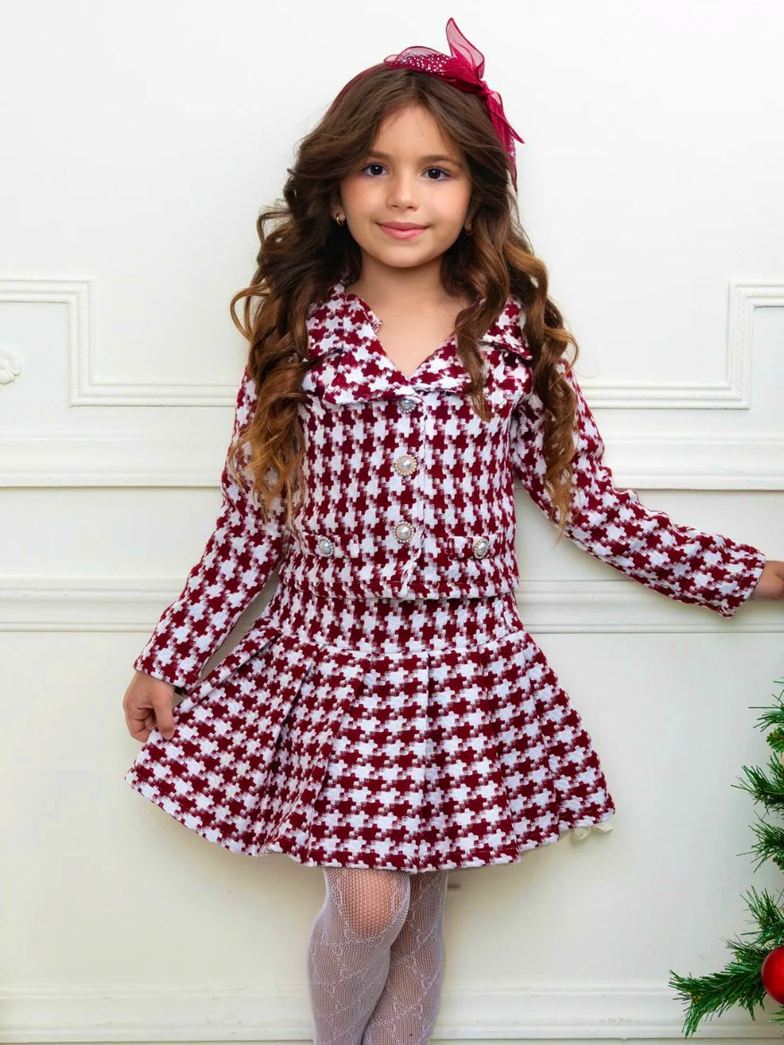 Burgundy Houndstooth Jacket and Pleated Skirt Set