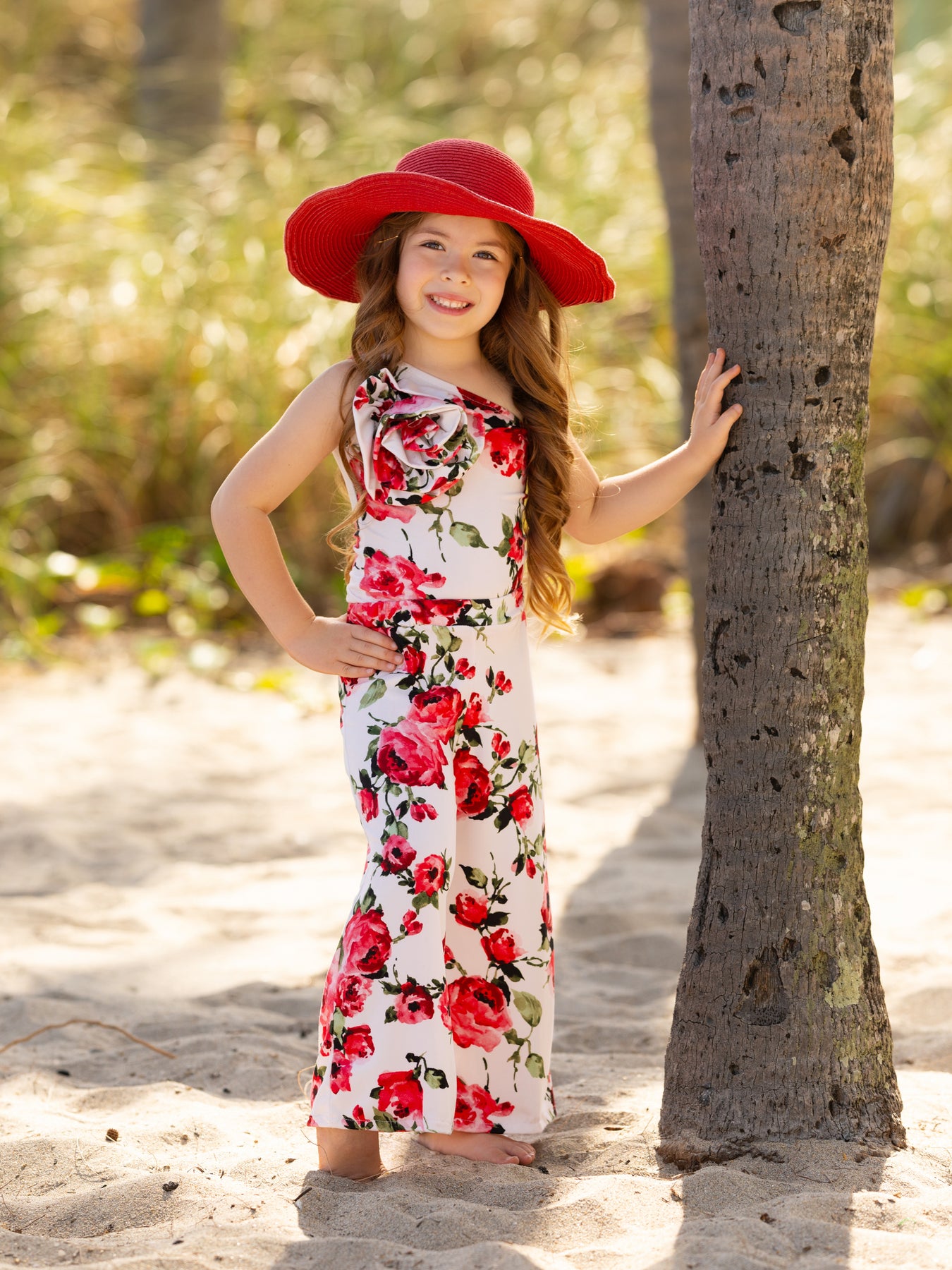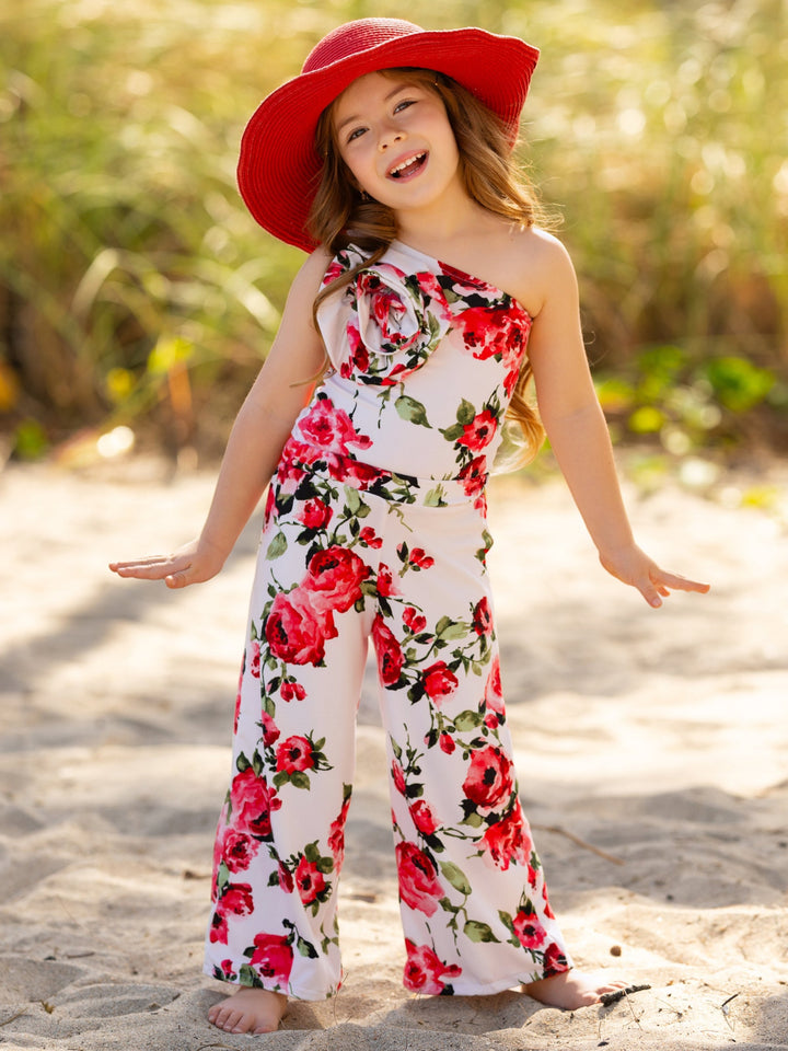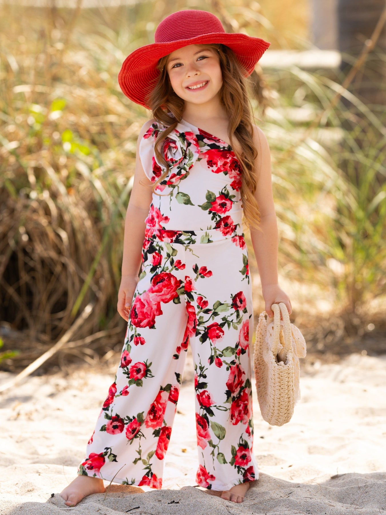 - This charming ensemble features a one shoulder top with rosette detail and wide-leg pants, both adorned with a vibrant red and pink rose print that’s perfect for any occasion.