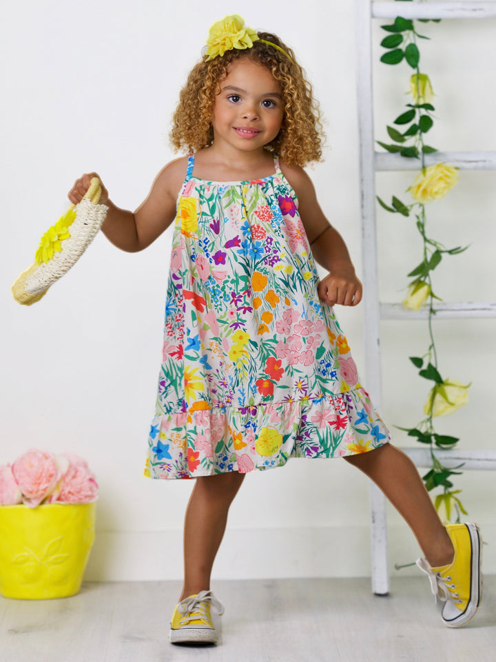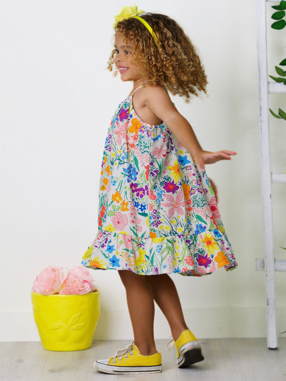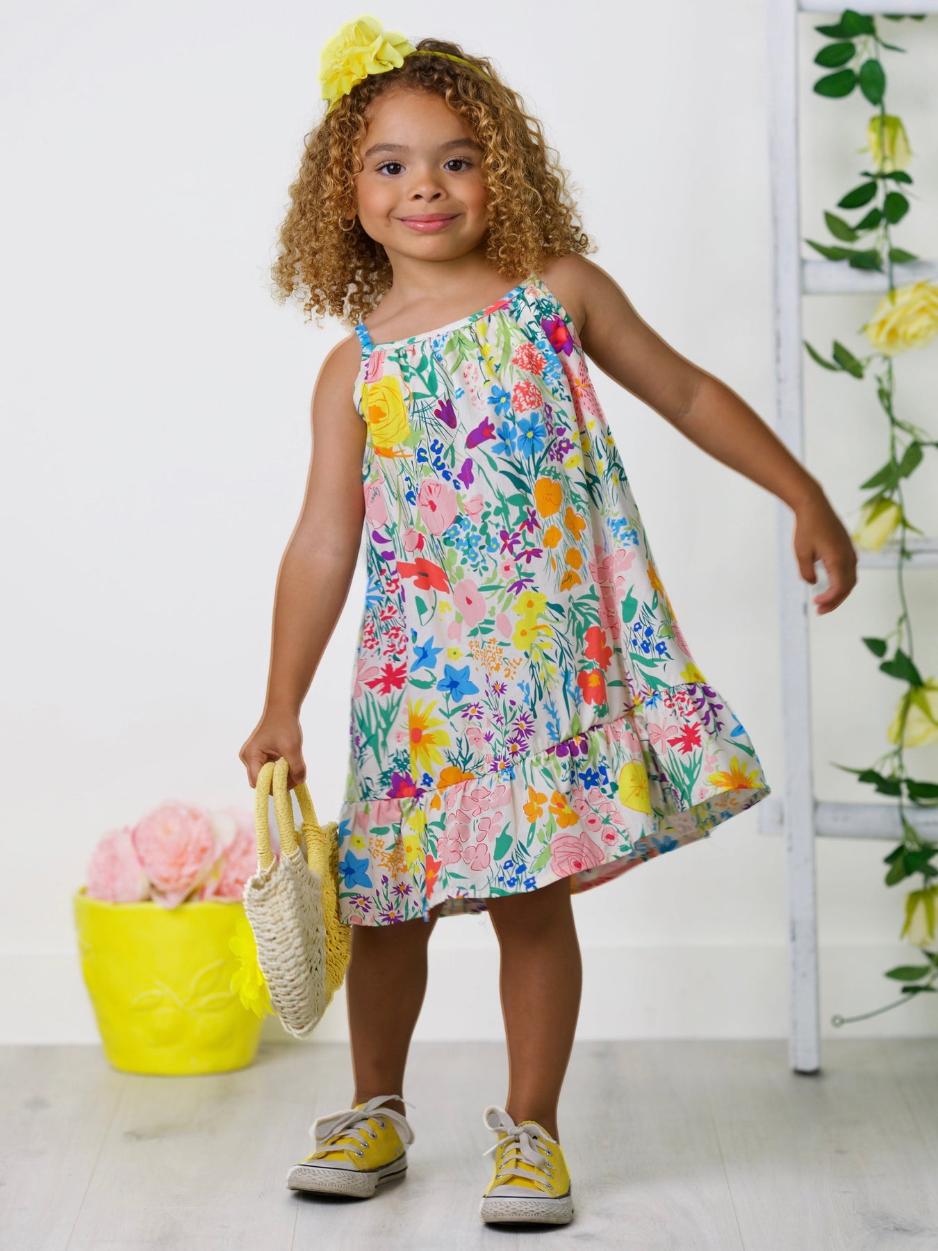 Bright blooms and happy colors all over our floral ruffle dress to make your little girl smile. As pretty as spring flowers, this piece features the season's best details so she can twirl in delight. Cue the compliments and snap those pics!