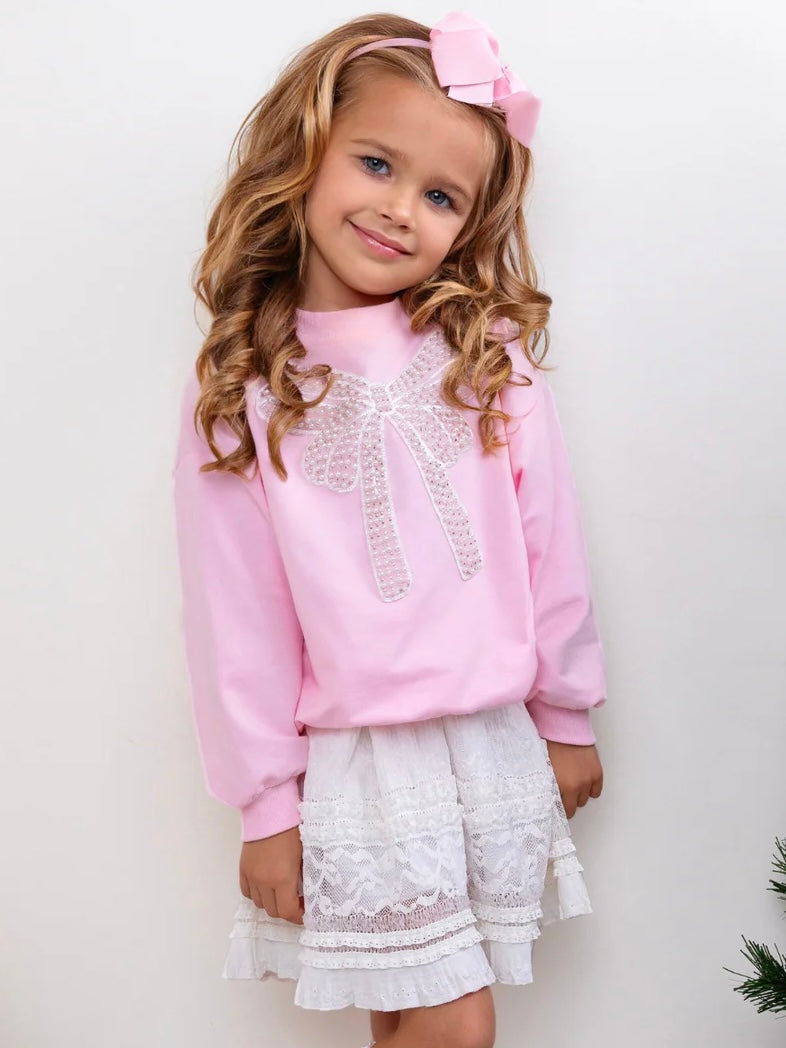 Pretty in Pink Pearl Bow Top and Lace Skirt Set